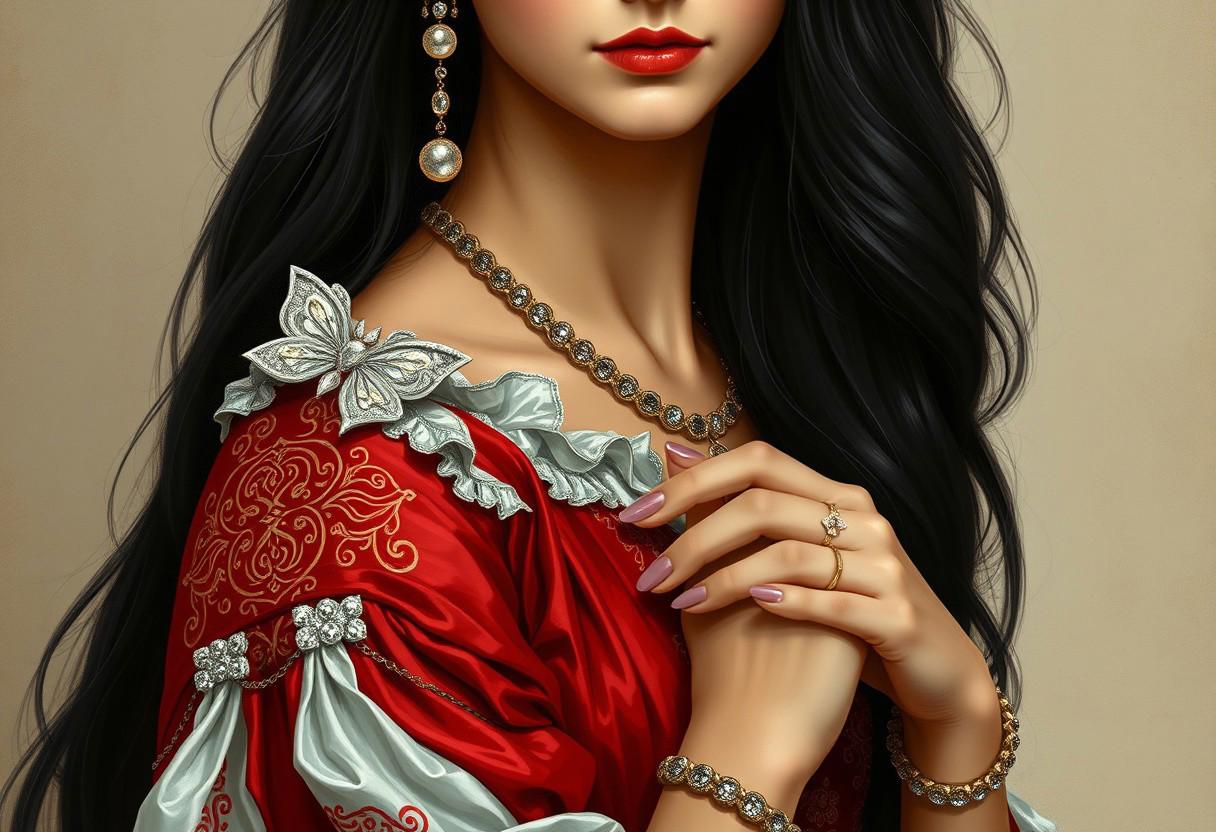 Full body, standing, close-up \ \ a masterpiece of the best quality \ \ (realistic: 1 .2), HDR, UHD, 8K laura:, cinnamon: 1 \ > Create an illustrated portrait of a woman in oil with expressive mesmerizing eyes and long black hair . She is dressed in a historical dress consisting of bright red and white tones, which emphasizes her elegance. It also features fine jewelry such as bracelets and necklaces that add sparkle and luxury to her look. The background is soft and neutral to draw attention to her and her outfit . The portrait conveys the atmosphere of sophistication and grace of the Baroque, Rococo style . Inspired by the works of the Golden Age masters Donatello, Michele Angelo, Leonardo Da Vinci, perfect anatomy, chic and glitz of the Baroque style. 8 ; 5 4 8 8 = B 5 @ 2 @ > < 0 = 5 ; 5 : A 0 = 4 @ 0 N < 0 " " @ 8 < C H : 5 B 5 @ 0" > ? 8 A K 2 0 5 B A O : 0 : 6 5 = I 8 = 0 = 5 > 1 K G 0 9 = > 9 : @ 0 A > B K 8 > 10 O = 8 O. = 0 1 K ; 0 2 K A > : > 9 8 A B @ > 9 = > 9, A @ > A : > H = K < 8 G 5 @ = K < 8 2 > ; > A 0 < 8 8 ? @ > = 7 8 B 5 ; L = K < 8 : 0 @ 8 < 8 3 ; 0 7 0 < 8. 5 : > 6 0 1 K ; 0 1 5 7 C ? @ 5 G = > 1 5 ; > 9, 0 3 C 1 K - ? > ; = K < 8 8 G C 2 A B 2 5 = = K < 8. Modifiers: Sharp focus extremely detailed crisp high-quality cinematic post\ \ - processed dramatic light by Luis Royo ultra-realistic occult optical illusion X . R. Gigera FHI sharp focus extremely detailed