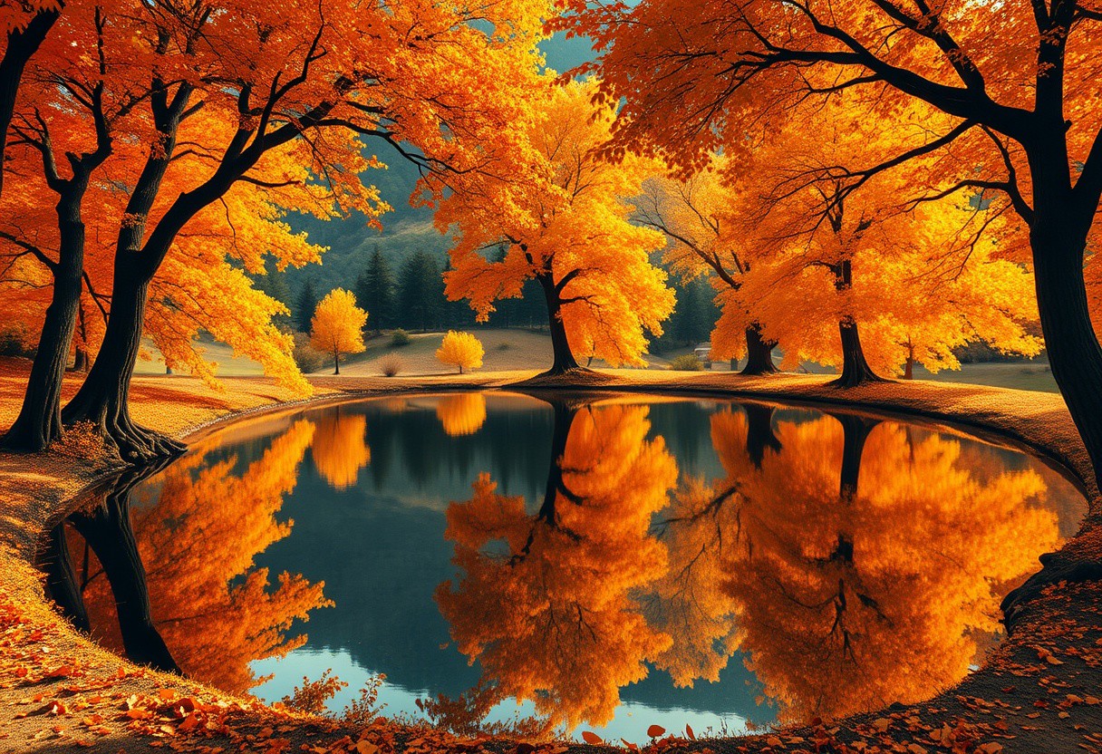 Stunning detail reflection of golden and orange katsura trees around a natural round lake, autumn, realistic, wide shot, art style of Studio Ghibli, magical, whimsical atmosphere, vibrant colors, beautifully lit, serene landscape