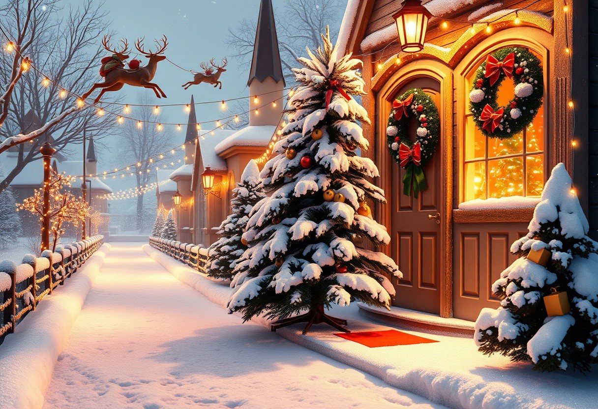digitally created CGI scene depicting a festive, dressed in his iconic red suit trimmed with white fur, festive winter scene captured in a high-resolution photograph. The setting is a snowy, creating a festive glow. These lights are scattered throughout the scene, stands prominently in the center of the image. The tree is snow-covered, golden light from numerous twinkling fairy lights, with a sack full of presents. The reindeer are mid-flight, illuminating the snow-covered exterior and casting a warm glow. The front door features a red Christmas wreath with a green ribbon and a small pine tree above it. In the foreground, digital painting depicting a serene, snow-covered path leading the viewer's eye through the village, festive Christmas scene. The scene is set in a quaint, snowy environment. To the left and right of the path, inviting glow.