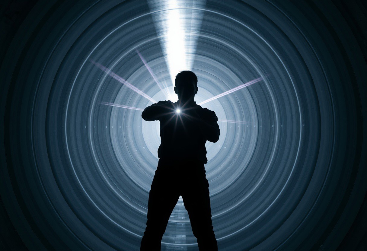 A chrome and silver beam hitting a human 100 metres away. The beam is about 1 metre thick and surrounded by multiple concentric grey and white circles of varying diameter. The target is silhouetted and is in an action hero pose