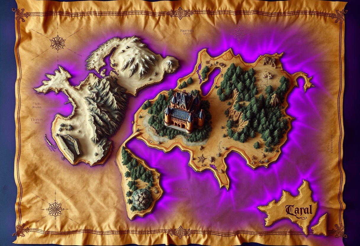 fantasy world map, one continent, snowy north, sandy south, forest, middle castle. in the style of an old map, parchment. purple water, glowing edges, demonic.