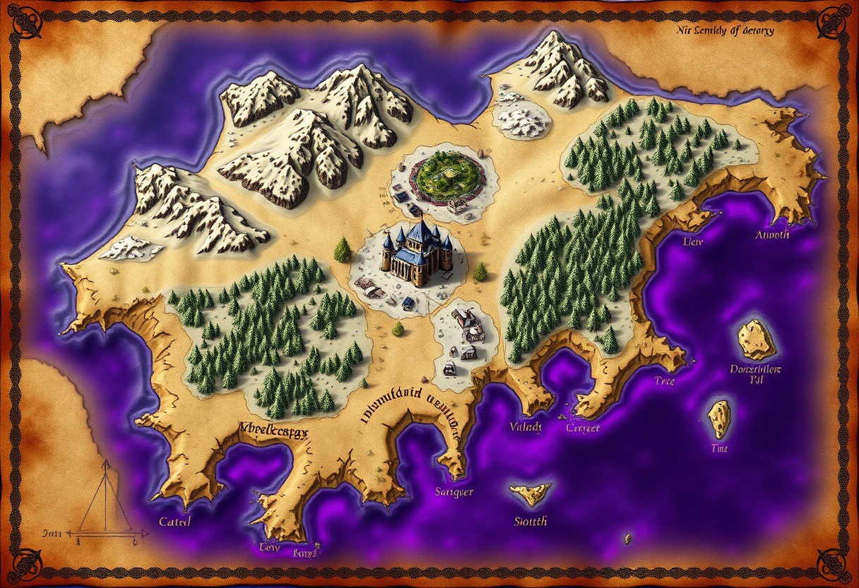 fantasy world map, one continent, snowy north, sandy south, forest, middle castle. in the style of an old map, parchment. purple water, glowing edges, demonic.
