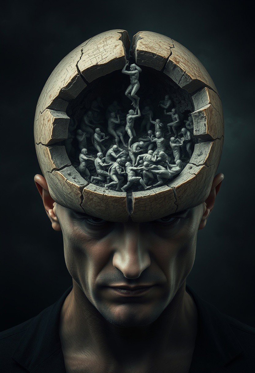 Surreal and dark image of a man with a cracked open skull, revealing a chaotic scene inside. Tiny human figures are struggling and intertwined within the brain cavity, depicting a scene of turmoil and conflict. The texture of the skull is highly detailed, with a dark, atmospheric background. The man’s expression is stern and intense, adding to the sense of inner strife and unease.