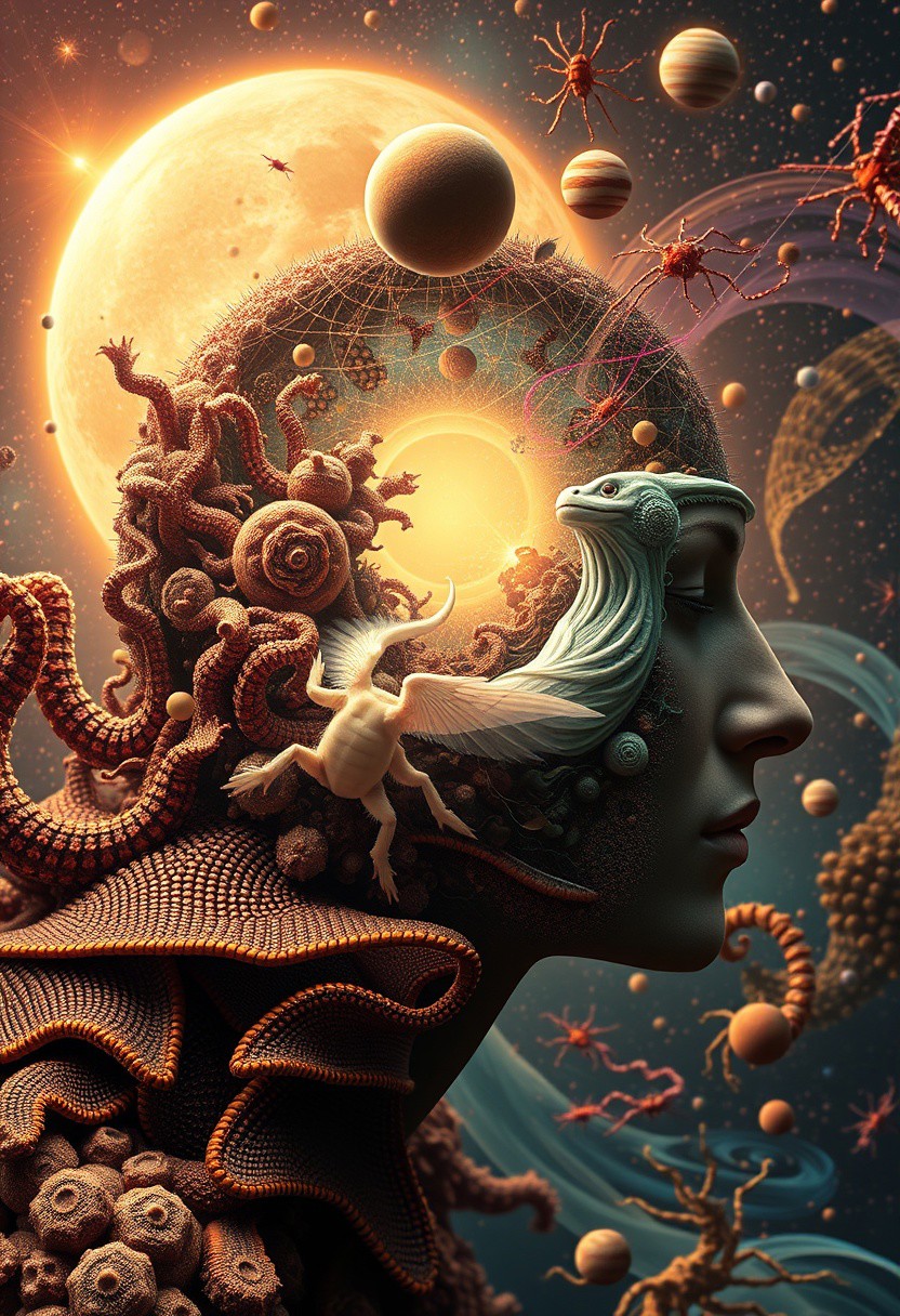 DMT, lsd inspired optical 3d inner mind journey, illusion in time . includes hidden traces of, bio matter, insects, faces, reptilian creatures, planets, microbes, peaceful , inspirational,deep sea life , yin yang, cycle of life, surf, AI cyborg integration