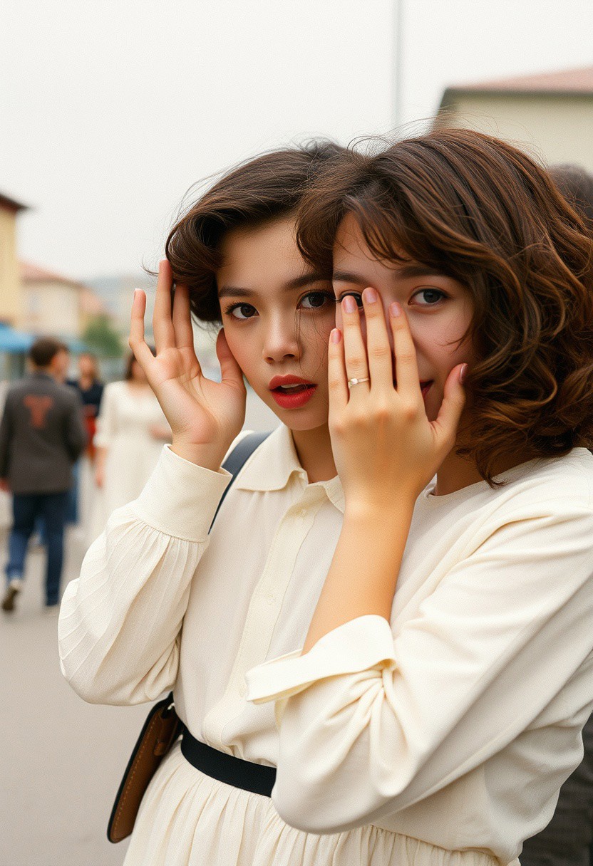This vintage analog film photograph depicts a tranquil and intimate scenery in Soviet provincial city. Characters on this photo features an absolutely correctly rendered eyes, fingers and overall anatomy is perfect without anatomical flaws. Natural imperfections of anatomy and skin texture adds realism and analog film qualities. Natural skin texture has a pigment variations sparse blemishes and rare moles. Eye shine is natural and realistic. Finest details emphasize the micro contrast and crispy textures. 1girl. solo. realistic photograph. photorealistic. looking at viewer. brown hair. short hair. dress. long sleeves. tatar. blurry. blurry background. white dress. black eyes. shirt. upper body. curly hair. hands up. white shirt. white skirt. tongue. brown eyes. skirt. hand on own face