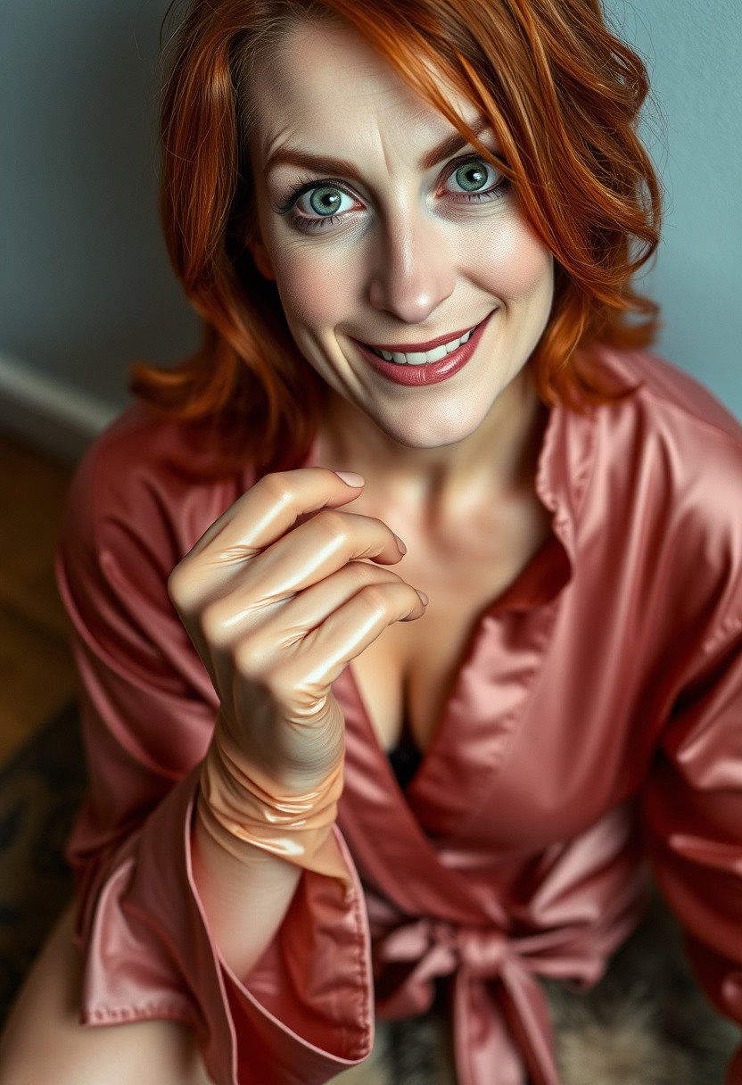 A pretty mature woman looking down at the viewer. She is fitting a latex glove. Her hair is red and her eyes are bright green. She has a condescending smile in her face as if she were planning something evil. She is wearing a pretty but casual silk robe, together with fur slides. Her body is toned and fit. She is in her mid 40s and looks very attractive. The image comes from a low angle, as if the viewer were down on the floor.