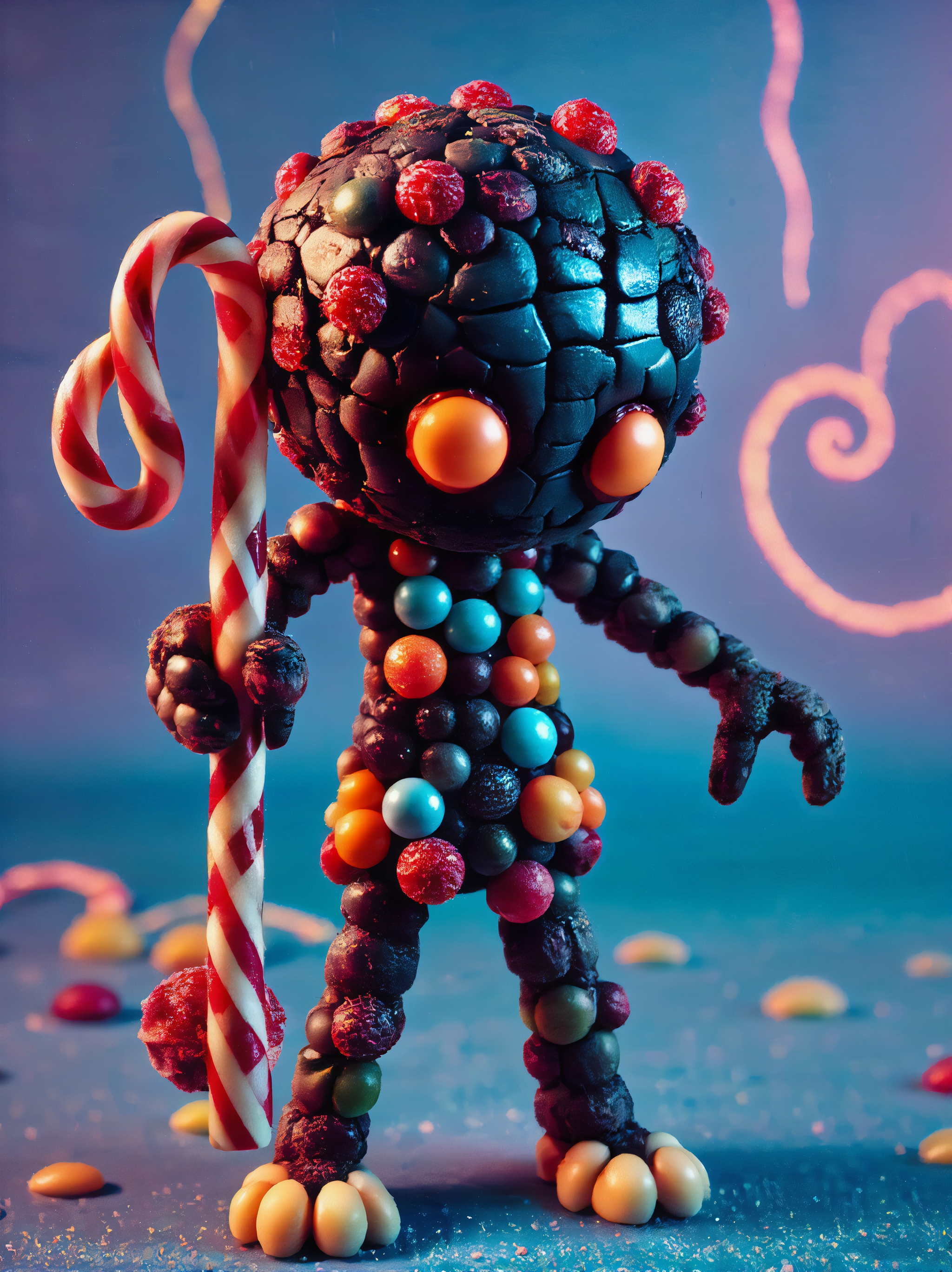 A dark, twisted figure crafted from candy sweets,chrc4nd7, with leathery, cracked skin and flaming pustules, stands against a vibrant, neon azure backdrop, reminiscent of a Guillermo del Toro-esque scene, with warm, golden lighting and deep shadows, evoking a sense of eerie wonder, as if shot on 35mm film with a subtle grain and muted color grading, the figure's sugar cane gleams with a soft, warm glow, its eyes aglow with an inner fire.