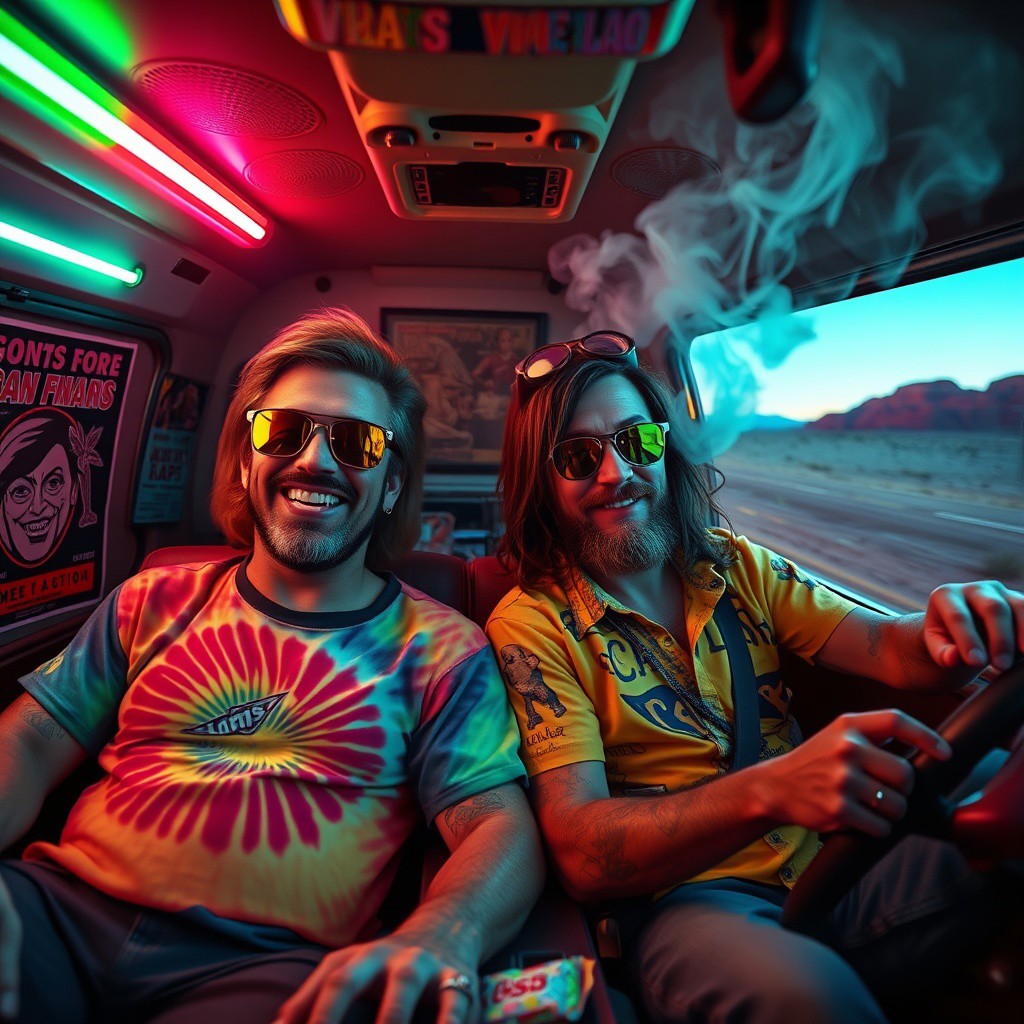 High resolution, masterpiece quality, source_8_up, hyper-realistic lighting, ultra-detailed textures, cinematic depth of field, HDR: Render the scene with realistic lighting, sharp focus, dynamic reflections, and smooth gradients. Emphasize neon glows, ambient occlusion, and photorealistic reflections. "Two laid-back stoner characters, resembling Cheech and Chong—Jake in a colorful tie-dye shirt and a short, mustached face with a wide grin, and Terry with long hair, wearing reflective sunglasses and a slightly scruffy beard—sit in a vintage, psychedelic van on a sun-scorched highway. The van’s interior is cluttered with 70s rock band posters, glowing lava lamps casting neon pinks, blues, and greens. Soft, ethereal smoke swirls, shifting colors with the light. Outside, the vast desert stretches with warped heat distortion. Floating snacks, glowing chips, and candy wrappers hover, casting psychedelic light. Their expressions are exaggerated: Terry is hyperactive, wide-eyed, with disheveled hair, while Jake is relaxed, leaning back with a goofy grin. Surreal, abstract shapes and glowing orbs float around, representing their trippy conversation. The atmosphere feels dreamlike, constantly shifting with glowing textures, reflections, vibrant neon hues, and dynamic lighting."