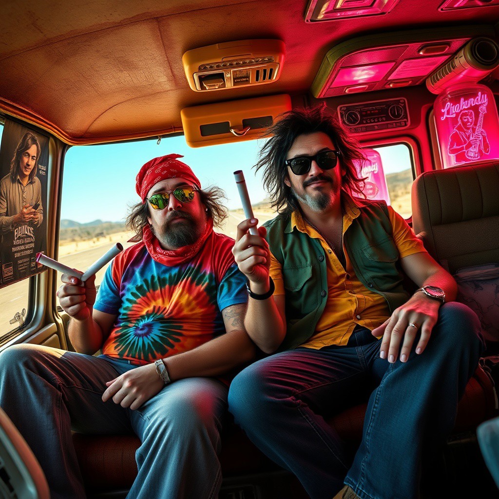 High resolution, masterpiece quality, source_8_up, hyper-realistic lighting, ultra-detailed textures, cinematic depth of field, HDR: Render with realistic lighting, sharp focus, dynamic reflections, and smooth gradients. Emphasize neon glows, ambient occlusion, and photorealistic reflections. "Two laid-back stoner characters resembling the younger Cheech and Chong—Jake, with a thick mustache, wearing a red bandana, a brightly colored tie-dye shirt, and bell-bottom jeans, captures Cheech Marin's look from the 1970s. Terry, tall with long, wild black hair, a scruffy beard, wearing reflective sunglasses, a green vest, and bell-bottom jeans, mirrors Tommy Chong's signature style from their early days. Both characters hold blunts in their hands, casually puffing and passing them. They sit in a vintage, psychedelic van on a sun-scorched highway. The van’s interior is cluttered with 70s rock band posters, glowing lava lamps casting neon pinks, blues, and greens. Soft, ethereal smoke swirls, shifting colors with the light. Outside, the vast desert stretches with warped heat distortion. Floating snacks, glowing chips, and candy wrappers hover, casting psychedelic light. Terry is animated, wide-eyed, with messy hair, while Jake is relaxed, leaning back with a goofy grin. Surreal, abstract shapes and glowing orbs float around, representing their trippy conversation. The atmosphere feels dreamlike, constantly shifting with glowing textures, vibrant neon hues, and dynamic lighting.