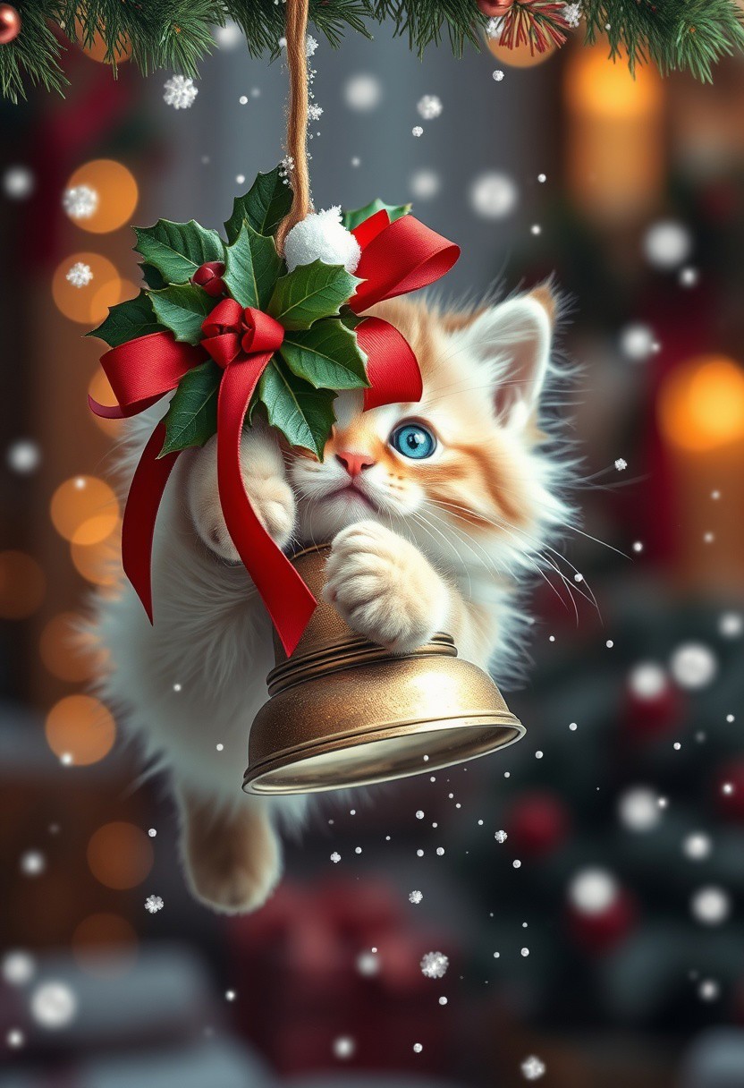 A whimsical winter wonderland scene captures a fluffy kitten's playful essence as it mid-bat at a hanging Christmas bell adorned with lush holly and crimson ribbon. The kitten's bright blue eyes sparkle with mischief, surrounded by soft, feathery whiskers and ultra-realistic fur. A sprinkle of tiny snowflakes dances around the bell, suspended in mid-air amidst warm, cozy indoor ambiance, illuminated by soft bokeh lights.