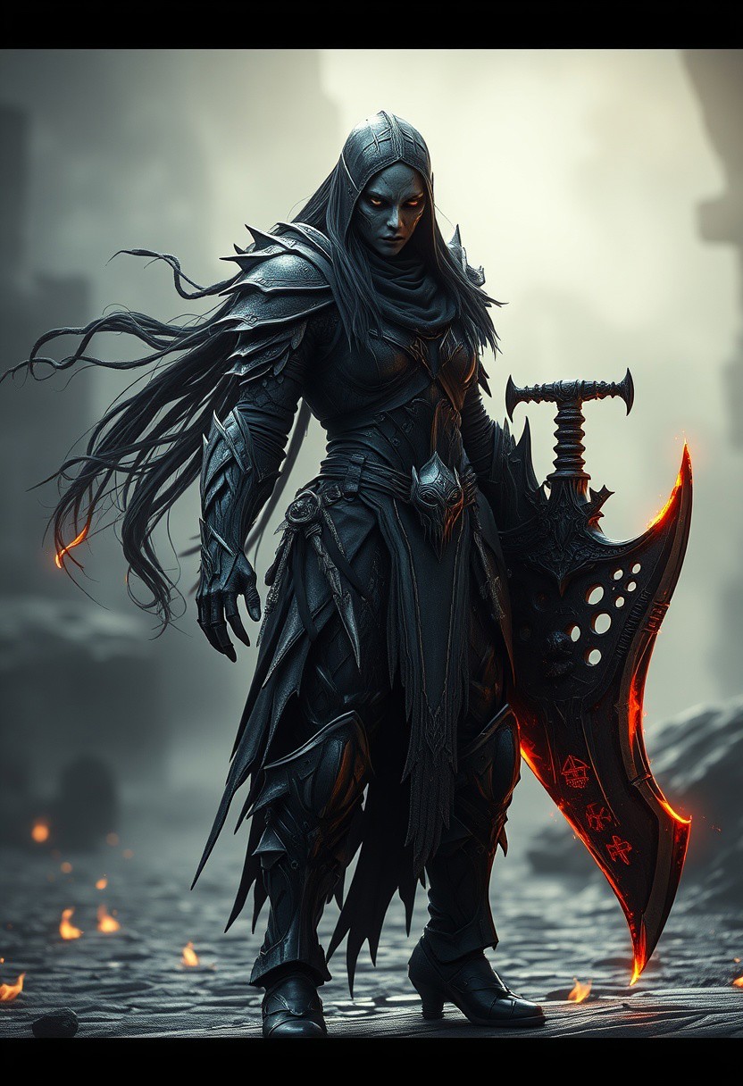 source_8_up, source_7_up, masterpiece, ultra_res, high_res, detailed, cinematic lighting, photorealistic, hyperdetailed, intricate textures, ambient occlusion, glowing highlights, surreal shadows, atmospheric depth, volumetric lighting, sharp focus, depth_of_field, ultra-realistic, high-definition, a tall, imposing woman clad in jagged, blackened armor that seems to shift and shimmer like liquid metal. Her face is hidden beneath a smooth, featureless mask that reflects faint distorted images of the world around her. Long, dark tendrils of hair flow behind her, tipped with glowing embers that flicker like fire. Her right arm is encased in a twisted gauntlet, its sharp edges glowing faintly red as if forged from molten steel. She carries a massive, jagged blade strapped to her back, etched with glowing runes that pulse rhythmically, as though alive. Her footsteps leave behind scorched, cracked earth, and a faint trail of ash follows her movements. Her aura exudes raw, destructive power, and her very presence warps the ground beneath her into unnatural, jagged shapes."