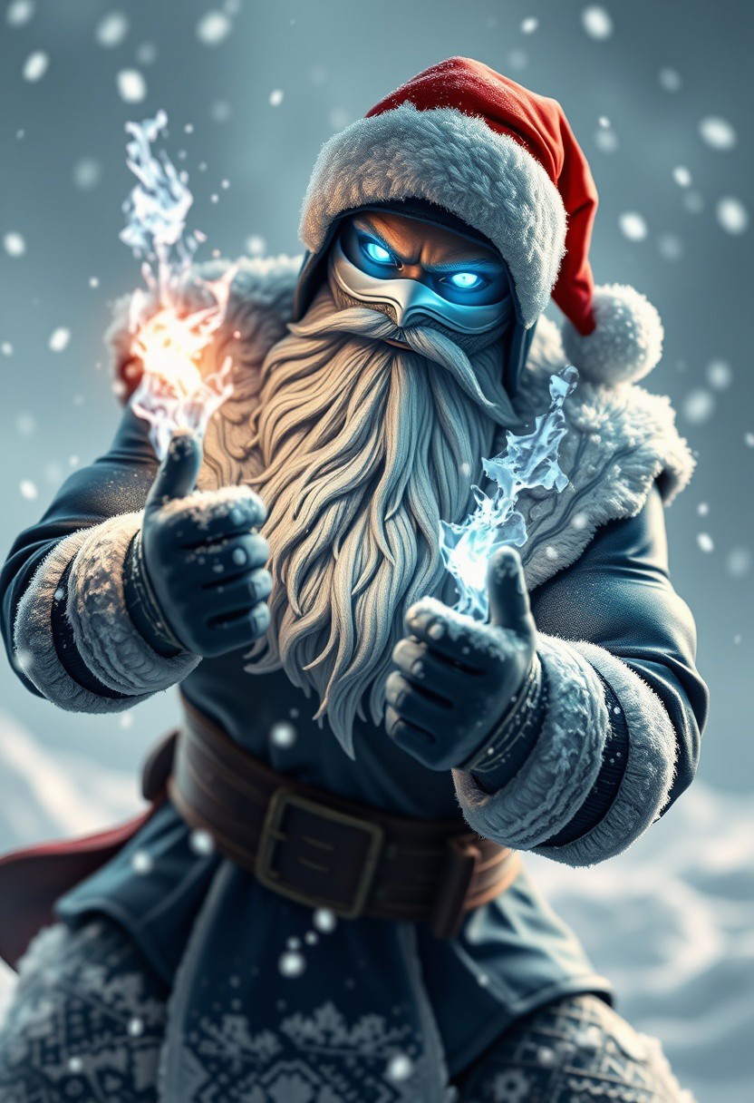 Sub-Zero from Mortal Kombat as Santa Claus, "Happy New Year", brutally, snow, ice, cold, cold breathing, strong:1.3, ((ninja)), Lin Kuei clan, 3d, blue eyes, fighter, fighting, powerful, violence, angry, pride, masterpiece, frozen magic, brutal, hard, evil, in blue ninja costume, cold magic, realistic, hd, hyper detailed, sport figure, shadows, reflection, reflections, karate