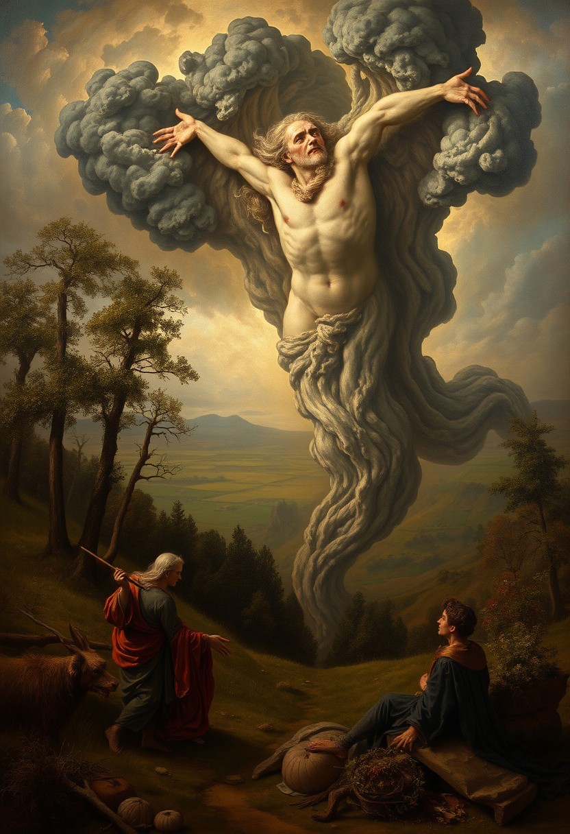A classic oil painting depicting an epic vision of despair and supernatural torment. The style is romantic landscape, classical realism with a Pre-Raphaelite influence, showing serene rural scenes with religious and mythological themes. Rich colors and detailed brushwork create a harmonious composition with high contrast, low-key lighting, deep shadows, and visible brushstrokes.