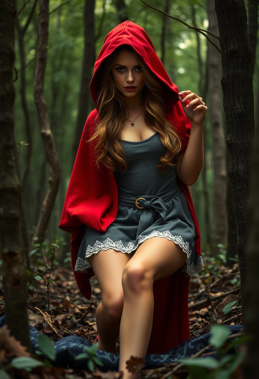 Little Red Riding Hood, in the forest, mystical, long sexy legs, seductive look