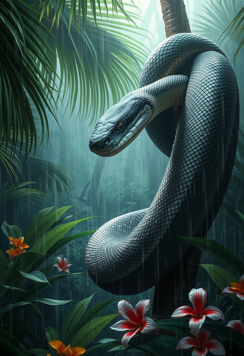 A detailed shot of a massive boa constrictor coiled around a rain-soaked palm tree in a lush tropical rainforest, its scales glistening with water droplets. The snake's head is alert and focused, scanning the misty undergrowth below for potential prey. Heavy rain creates a dramatic atmosphere with water streaming down broad jungle leaves, while shafts of filtered sunlight pierce through the dense canopy. Vibrant green foliage and exotic flowers add splashes of color to the moody scene. Photorealistic style, high detail, atmospheric lighting. Anime Style