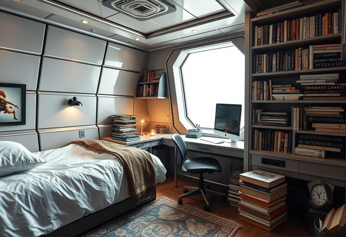 compact spaceship bedroom for apprentice magician with a computer a bed and piles of book. no decoration full metal room looking like a cubicle