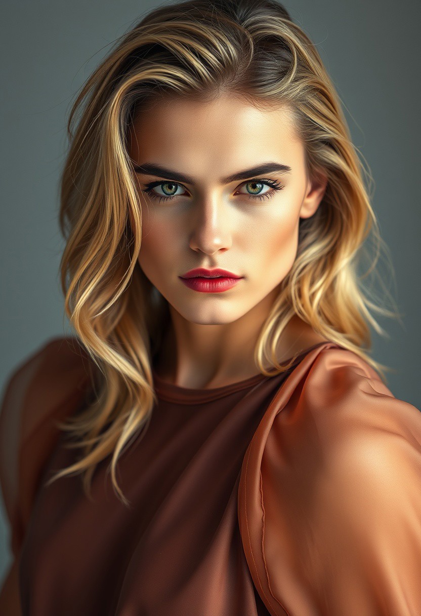 A strikingly beautiful 25-year-old man with androgynous features, smooth, flawless skin, and long flowing hair styled in loose, playful waves framing his face. His eyes, lined with a subtle winged eyeliner and a touch of shimmering gold shadow, sparkle with mischief and a hint of playful seduction. A swipe of shimmering pink lipstick adds a touch of playful defiance, a confident flourish in his embrace of his own unique beauty. He wears a flowing silk dress with delicate lace detailing, the fabric moving with a fluid grace as it drapes over his slender frame. His jawline is softly defined, his features delicate and feminine. He gazes directly at the viewer with a hint of a smirk, an air of confident sensuality radiating from him, a man who delights in the fluidity of his gender expression.