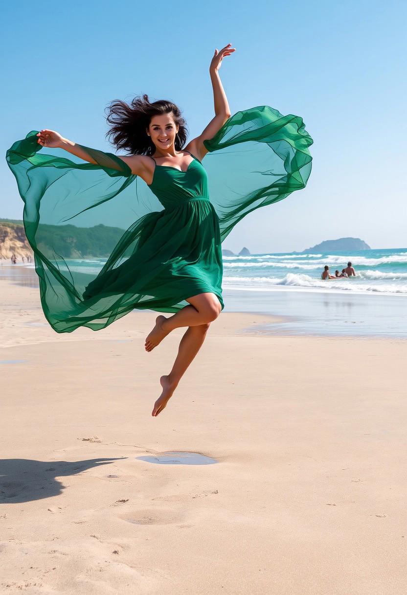 A dynamic photograph captures a woman in mid-air, wearing an emerald green flowing dress with semi-sheer sleeves that creates an expansive circle around her as she jumps or dances on a wet sandy beach. The dress's material is lightweight and translucent, billowing dramatically outward to reveal intricate folds, textures, and patterns. Her dark hair cascades freely, contrasting beautifully against the vibrant fabric. She has both arms raised above her head in a ballet-like pose, while her legs are en pointe, one foot lifted behind her. Her expression is focused and intense, gazing directly at the camera with a slight smile. The foreground features smooth, reflective sand with small puddles scattered across it, creating a glossy surface that enhances the shimmering effect of the sunlight. The background showcases a serene ocean with gentle waves rolling onto the shore, where white foam adds texture to the scene. A few people can be seen enjoying the water, walking along the shoreline, or lounging on colorful towels. Distant cliffs with lush vegetation line the horizon under a clear sky transitioning from light blue at the top to a slightly darker shade near the earth. The natural lighting creates a warm tone throughout the image, emphasizing the vivid colors and the ethereal quality of the moment. The composition centers the dancer against the picturesque coastal landscape, resulting in a striking contrast between the dynamic subject and the calm surroundings.