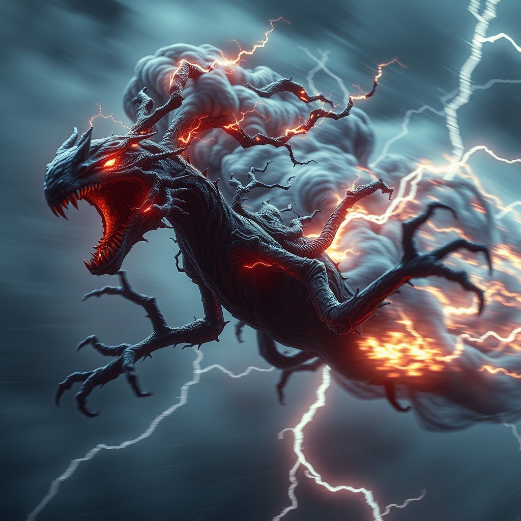 masterpiece, ultra_res, high_res, cinematic_lighting, sharp_detail, hyperrealistic, eerie_glow, ominous, unsettling_aura, nightmare_fuel, high_velocity "A creature that moves at terrifying speeds, a blur of motion, its form constantly shifting and distorting as it zips through the air like a living streak of lightning. Its body is a jagged, serpentine form, with limbs that twist and snap, resembling broken branches, all while a trail of black smoke and electric arcs follow its wake. The head is a void, no eyes, just an unsettling gaping hole that ripples and flickers like it’s distorting reality itself. As it moves, everything in its path warps, the air itself bending under the sheer velocity. The sound of its movement is a screeching, bone-shattering whine, like the sky itself is being torn apart. It can appear behind you in the blink of an eye, relentless, feeding on fear. No escape, no warning—just the suffocating sensation that it’s already there, right next to you, moving faster than anything should be able to