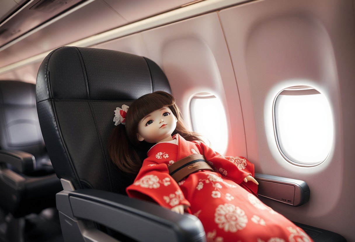 A doll wearing a Japanese red kimono is lying under the seat of an airplane, and the doll's hairstyle is Himeji style