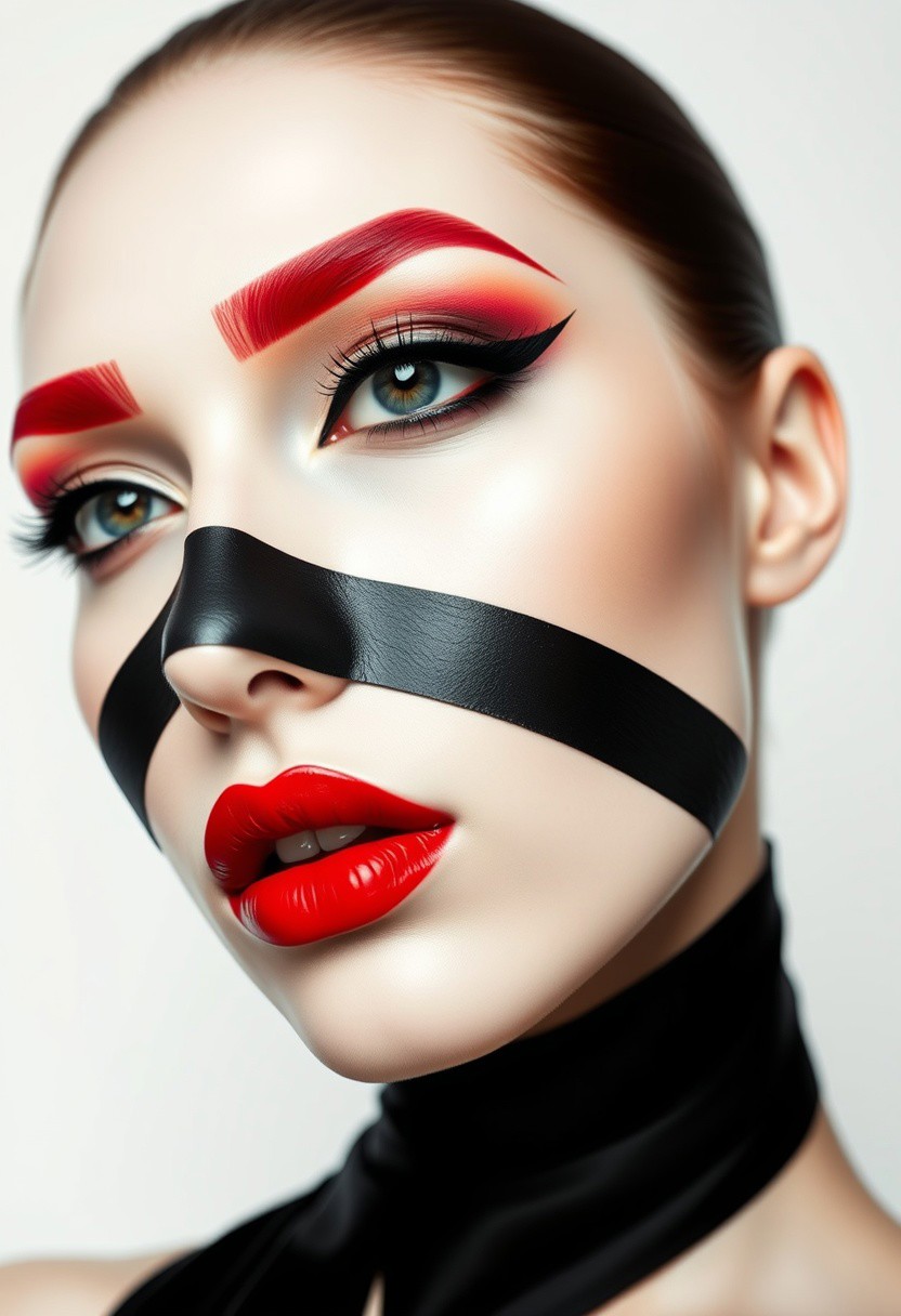 A stunning close-up portrait of a woman's face, blending high fashion and avant-garde artistry. The pale, porcelain skin serves as a pristine canvas for bold, graphic black stripes that slash diagonally across her face in a striking pattern. Her vivid red eyebrows and glossy, deep red lips create a fierce and dramatic contrast against the monochromatic palette of black and white. Her eye, with intense black eyeliner and soft lashes, gazes outward with enigmatic confidence, adding a sense of allure and mystery. The stark white background enhances the minimalist yet impactful aesthetic, emphasizing the sharp edges and vivid details of the makeup and styling. The composition exudes a bold, futuristic vibe, merging elegance with an edgy, artistic statement.