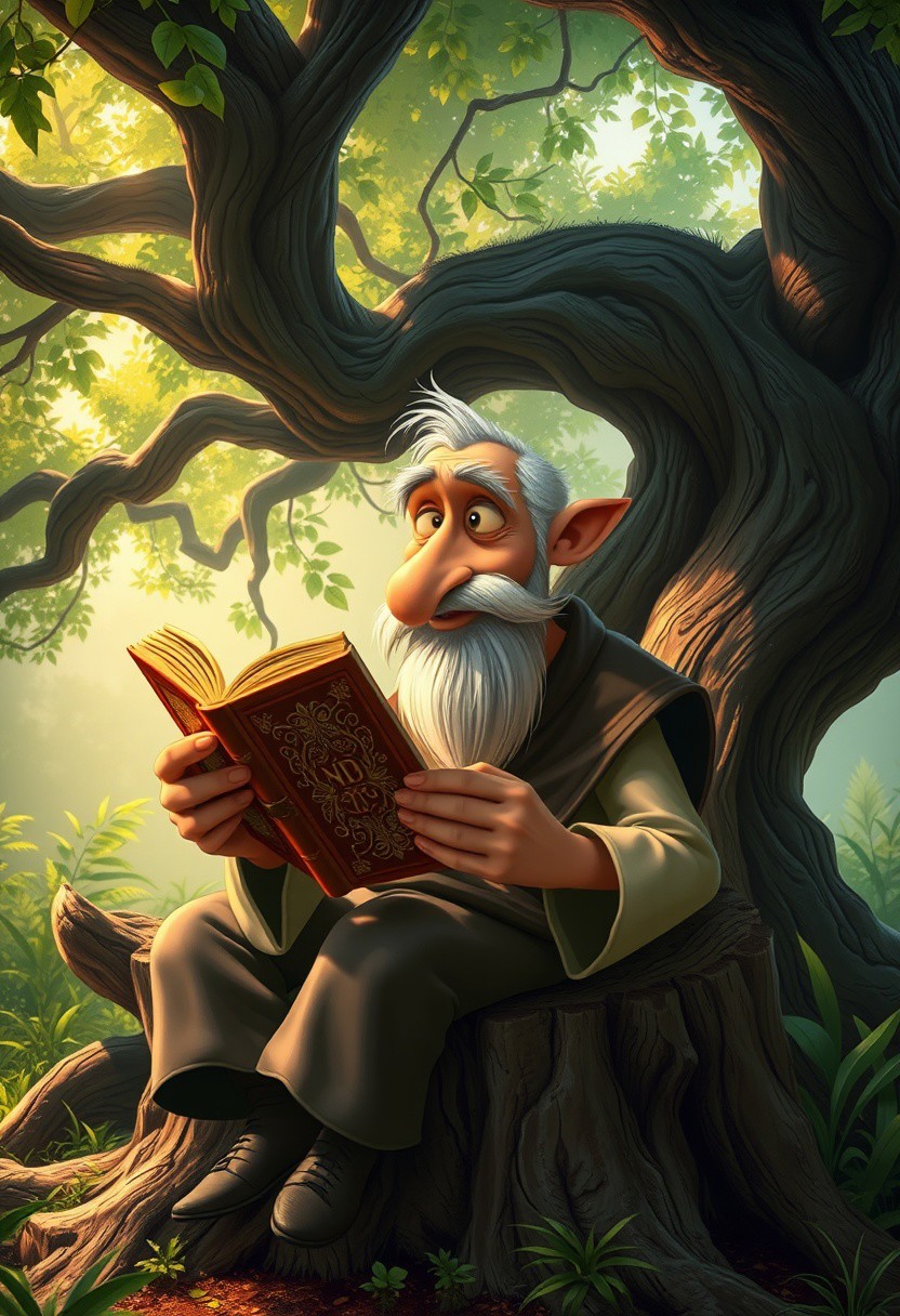 The scene features a whimsical, animated old man with a long, pointed nose, bushy eyebrows, and a wispy white beard. He is seated comfortably on a gnarled tree stump, surrounded by lush greenery and under the shade of an ancient, twisted tree. The man holds an old, leather-bound book with yellowed pages and intricate golden filigree in his hands, cradling it with reverence as he reads. The atmosphere is warm and tranquil, with soft, dappled sunlight filtering through the dense canopy above, casting an emerald green glow across the scene. The setting exudes wisdom, a deep connection to nature, and a serene sense of knowledge.