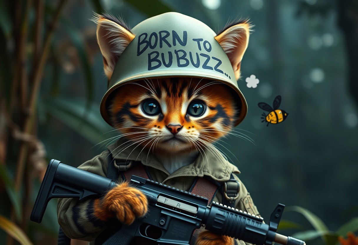 A mischievously cute but tough-looking kitten, dressed as a U.S. Marine during the Vietnam War. The kitten is wearing a slightly oversized olive-green military uniform and a flak jacket, holding a small M16 rifle with a playful yet rebellious expression. Its front helmet is adorned with the words “BORN TO BUZZ..” in bold, hand-painted letters, alongside a hand-drawn bee symbol buzzing aggressively. The backdrop features a dense jungle with hints of smoke and a humid, war-torn atmosphere. The kitten’s eyes gleam with a mix of charm and a cheeky “bad boy” attitude. Vibrant details, hyper-realistic fur texture, and cinematic lighting bring the scene to life.