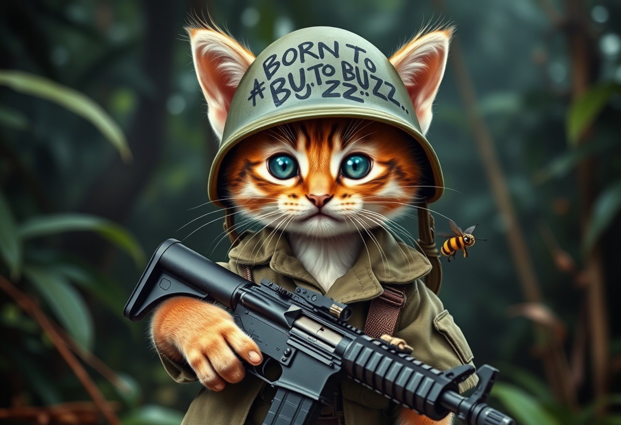 A mischievously cute but tough-looking kitten, dressed as a U.S. Marine during the Vietnam War. The kitten is wearing a slightly oversized olive-green military uniform and a flak jacket, holding a small M16 rifle with a playful yet rebellious expression. Its front helmet is adorned with the words “BORN TO BUZZ..” in bold, hand-painted letters, alongside a hand-drawn bee symbol buzzing aggressively. The backdrop features a dense jungle with hints of smoke and a humid, war-torn atmosphere. The kitten’s eyes gleam with a mix of charm and a cheeky “bad boy” attitude. Vibrant details, hyper-realistic fur texture, and cinematic lighting bring the scene to life.