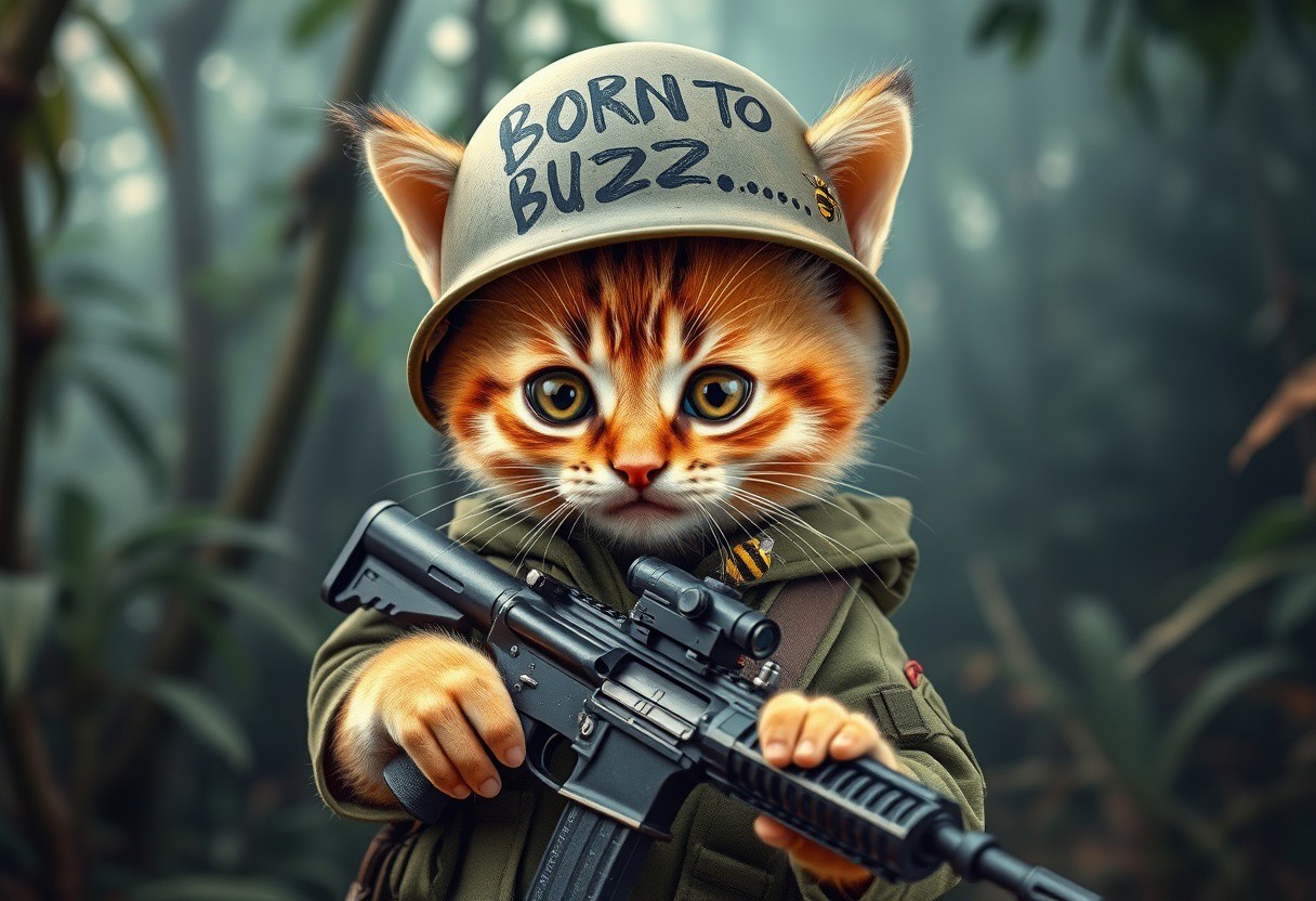 A mischievously cute but tough-looking kitten, dressed as a U.S. Marine during the Vietnam War. The kitten is wearing a slightly oversized olive-green military uniform and a flak jacket, holding a small M16 rifle with a playful yet rebellious expression. Its front helmet is adorned with the words “BORN TO BUZZ..” in bold, hand-painted letters, alongside a hand-drawn bee symbol buzzing aggressively. The backdrop features a dense jungle with hints of smoke and a humid, war-torn atmosphere. The kitten’s eyes gleam with a mix of charm and a cheeky “bad boy” attitude. Vibrant details, hyper-realistic fur texture, and cinematic lighting bring the scene to life.
