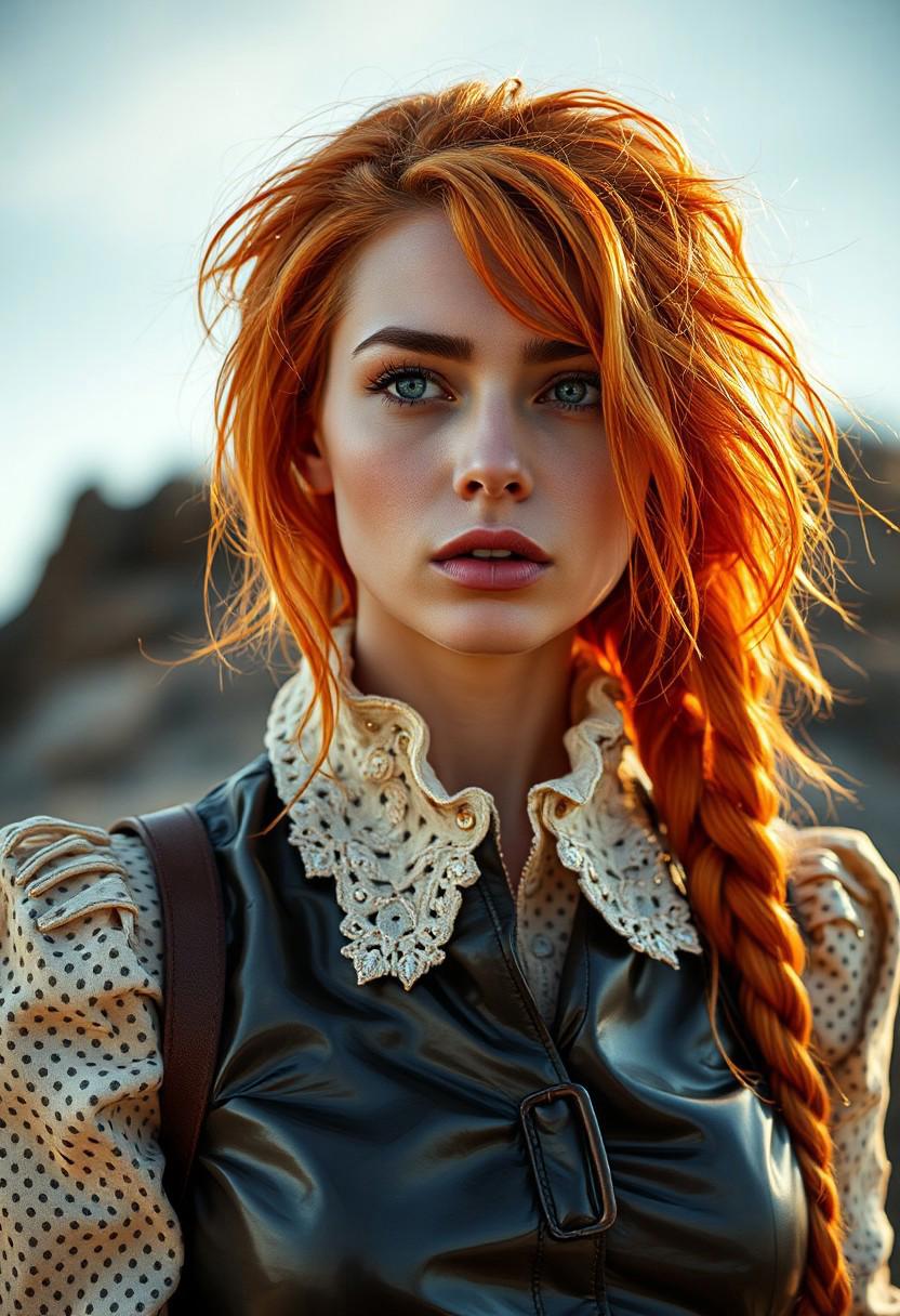 meticulous verisimilar realism, cinematic lighting masterwork DSLR HD photo, suis generis unique slippery latex fetish ginger slattern fashionista on expedition, formal Victorian stretched fetish latex Archeologist Fashion, seasoned matte skin, Kinesics face