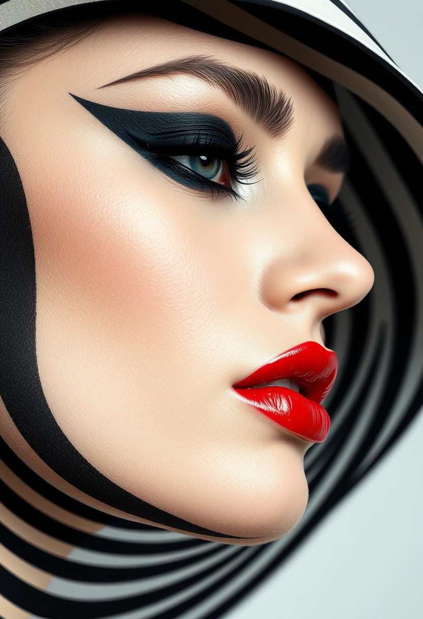 A striking close-up profile of a woman’s face adorned with bold, black stripes that wrap around the contours of her face, creating a hypnotic, zebra-like pattern against her smooth, pale skin. Her eyelids are covered in deep, matte black makeup that accentuates her long eyelashes, while her lips stand out in a glossy, vibrant red, offering a sharp contrast to the monochrome stripes. The image is minimalist yet visually intense, with the pattern seamlessly flowing across her features, evoking a sense of modern art and surreal beauty. RAW photo, masterpiece, photorealistic, 8k, best quality, stunning eyes, skin detail, skin pores, blemishes