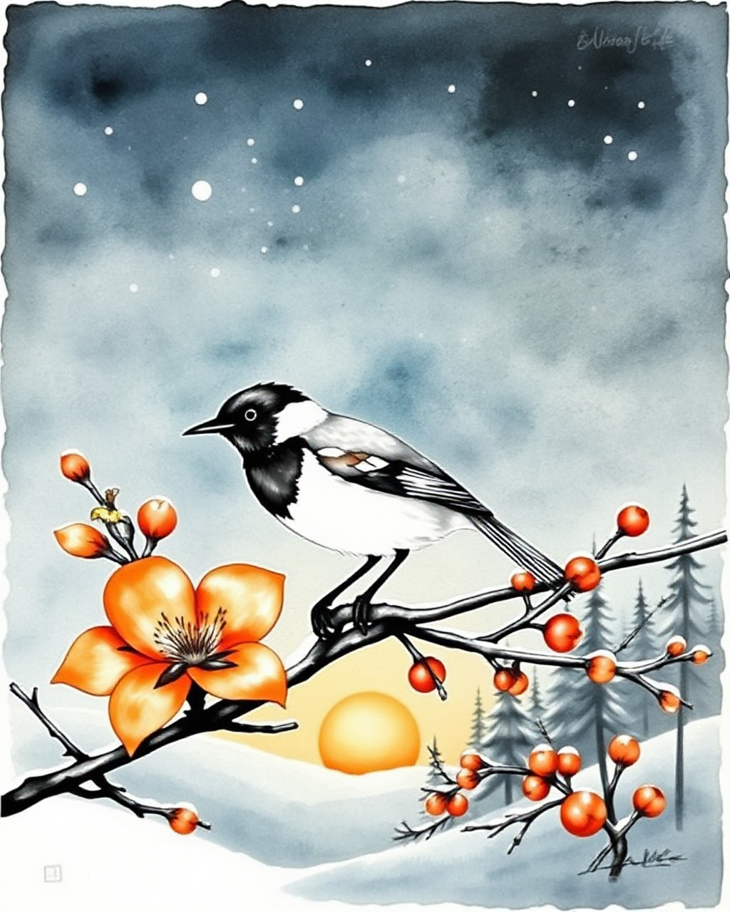 Ibo-christmas Vertical thirds, 1st ink wash magpie, 2nd orange blossom, 3rd setting sun