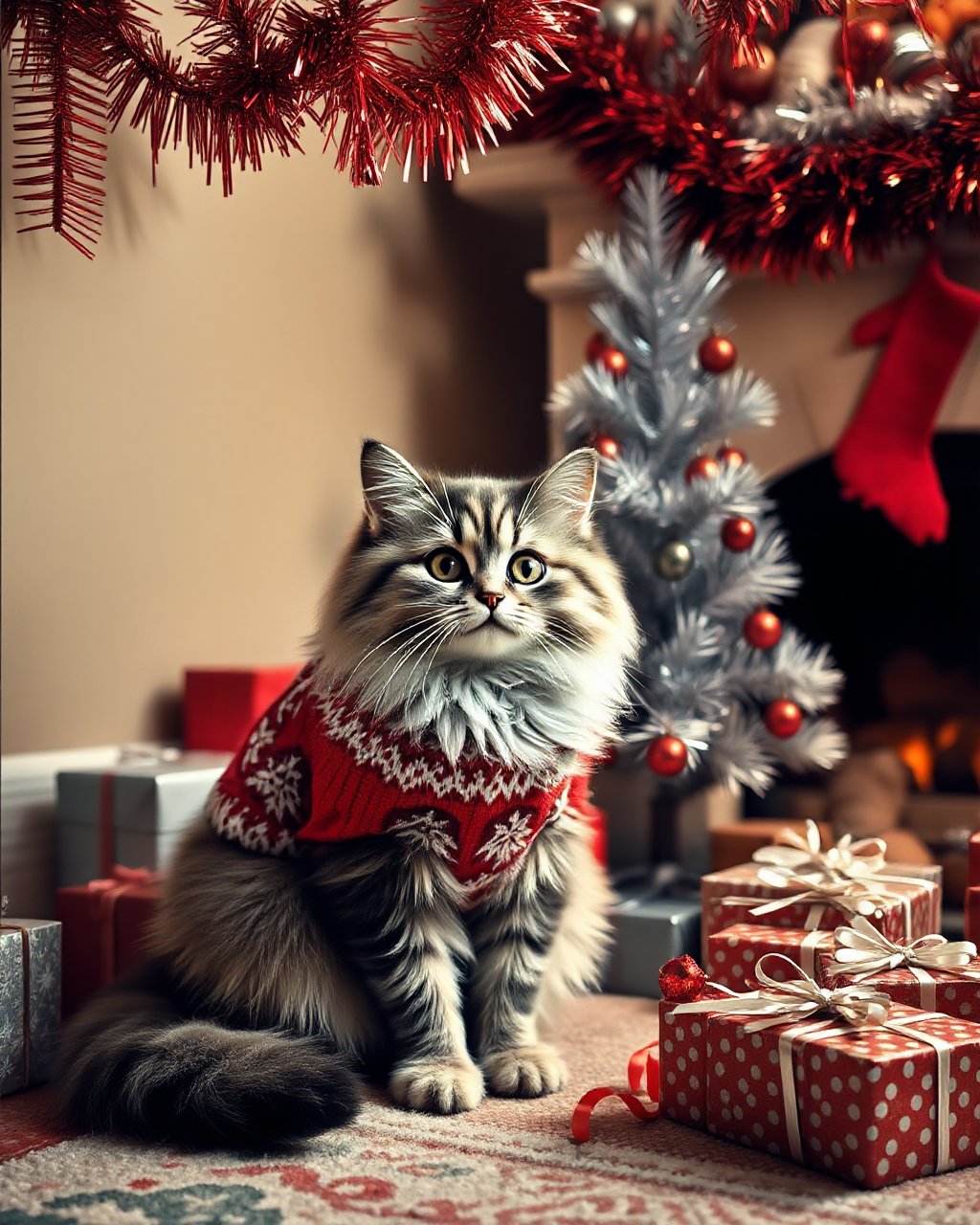 bo-christmas A fluffy kitty cat sits attentively by the fire wearing a CHristmas Jumper. Presents are amassed under the silver artificial tree in the corner. REd and god tinsel decorations hang for the ceiling