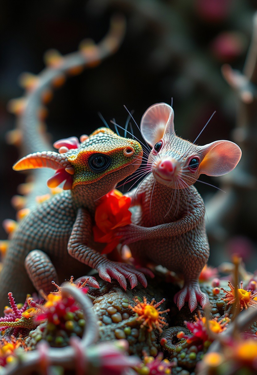 surreal VFX, nano-dragon and nano-rat best friends for life seen under an electron scanning microscope, with details, vivid colors