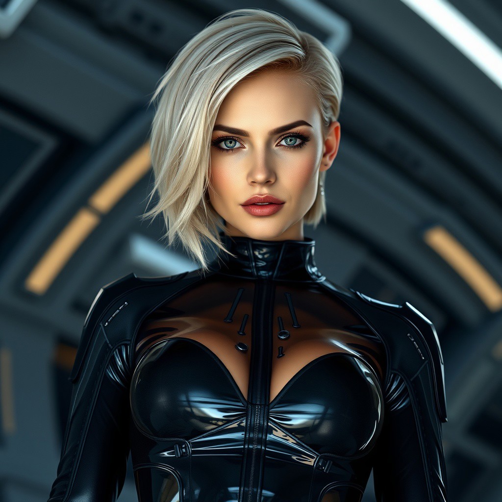 Star Citizen. A beautiful woman In full growth, blonde, Short haircut, Curvy body shapes, light green eyes, pink lipstick color. Dressed in a sexy tight black Transparent suit, low angle, epic composition.