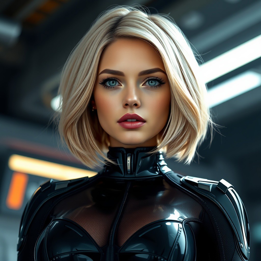 Star Citizen. A beautiful woman In full growth, blonde, Short haircut, Curvy body shapes, light green eyes, pink lipstick color. Dressed in a sexy tight black Transparent suit, low angle, epic composition.