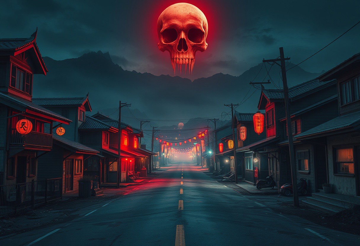 Cinematic photo, Realisti,A remote town called 'Zhiyong Town', with a medium shot composition. At night, the town is covered by a strange light, with no one on the streets and all the buildings around reflecting terrifying and strange colors. It's like entering a kaleidoscope world. The skull in the sky replaced the moon with a strange red light, and a pair of black hollow eyes looked at you! Focusing on the center of the road, the artistic style blends dark fantasy and Gothic art, with a sense of painting, emphasizing texture and dramatic lighting.