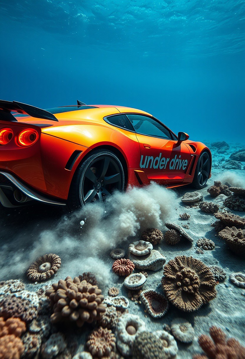 a sunken sport car is fast driving on the ocean floor, lot of small air bubbles are coming from the car, dust from the ocean floor is coming from the wheels, there are many corals under the water, beautiful lighting, big text on car body "under drive", sport car on ocean floor