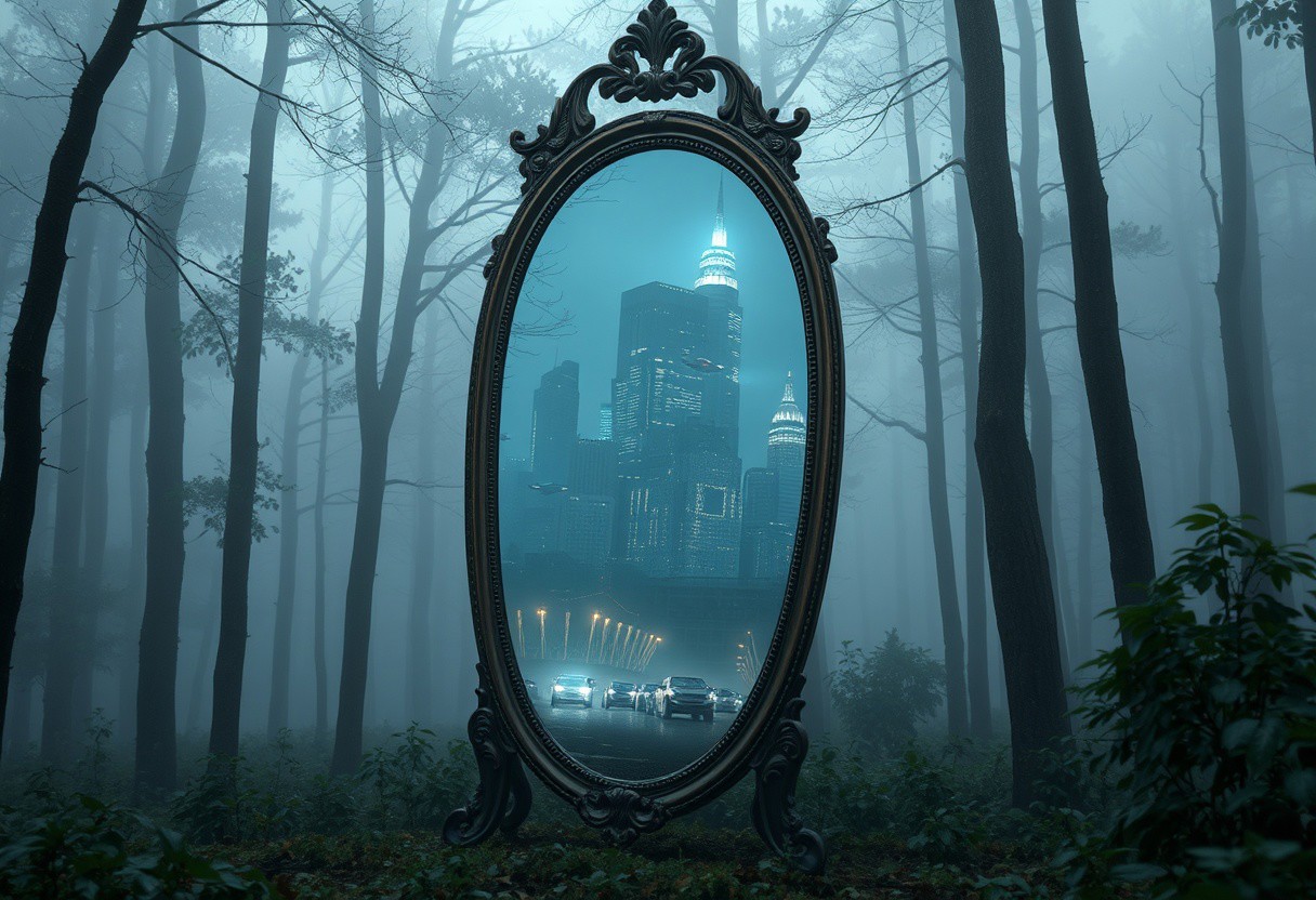 A freestanding, antique mirror sits in a dense, foggy forest, (but instead of reflecting the forest, it shows an entirely different world:1.4). Inside the mirror, a futuristic cityscape with flying vehicles and glowing skyscrapers pulses with life.Hyperrealistic glass textures, intricate alternate realities, and dramatic atmospheric effects.