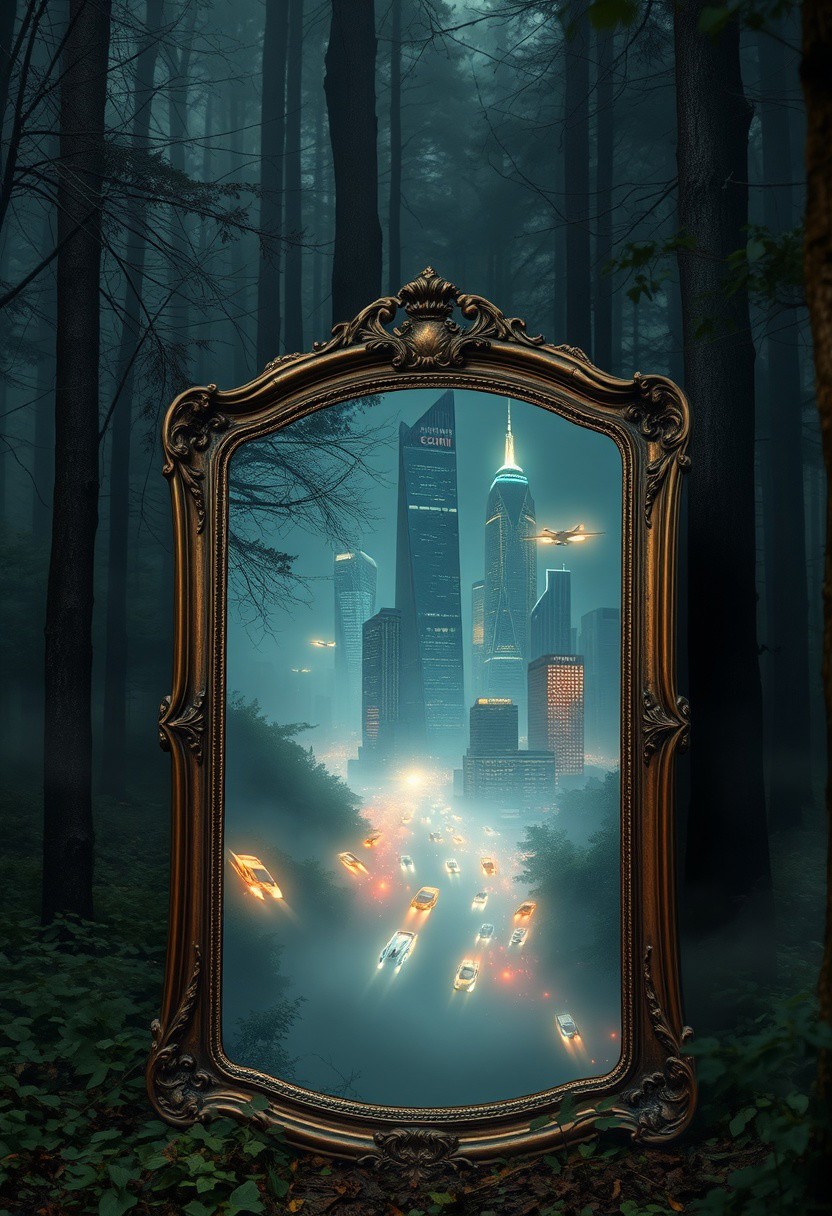 A freestanding, antique mirror sits in a dense, foggy forest, (but instead of reflecting the forest, it shows an entirely different world:1.4). Inside the mirror, a futuristic cityscape with flying vehicles and glowing skyscrapers pulses with life.Hyperrealistic glass textures, intricate alternate realities, and dramatic atmospheric effects.