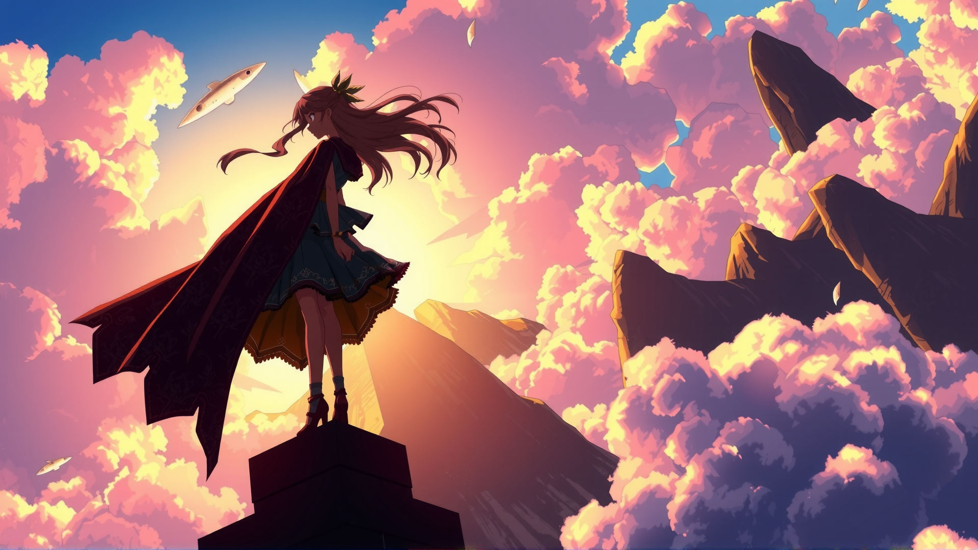 (an extremely high-quality anime artwork of a poised young woman standing atop an ancient stone tower, overlooking vast mountains), finely textured stone surfaces, intricate embroidered cloak, golden sunset hues, dramatic clouds, subtle motion in her hair, flux style, elegant wallpaper composition