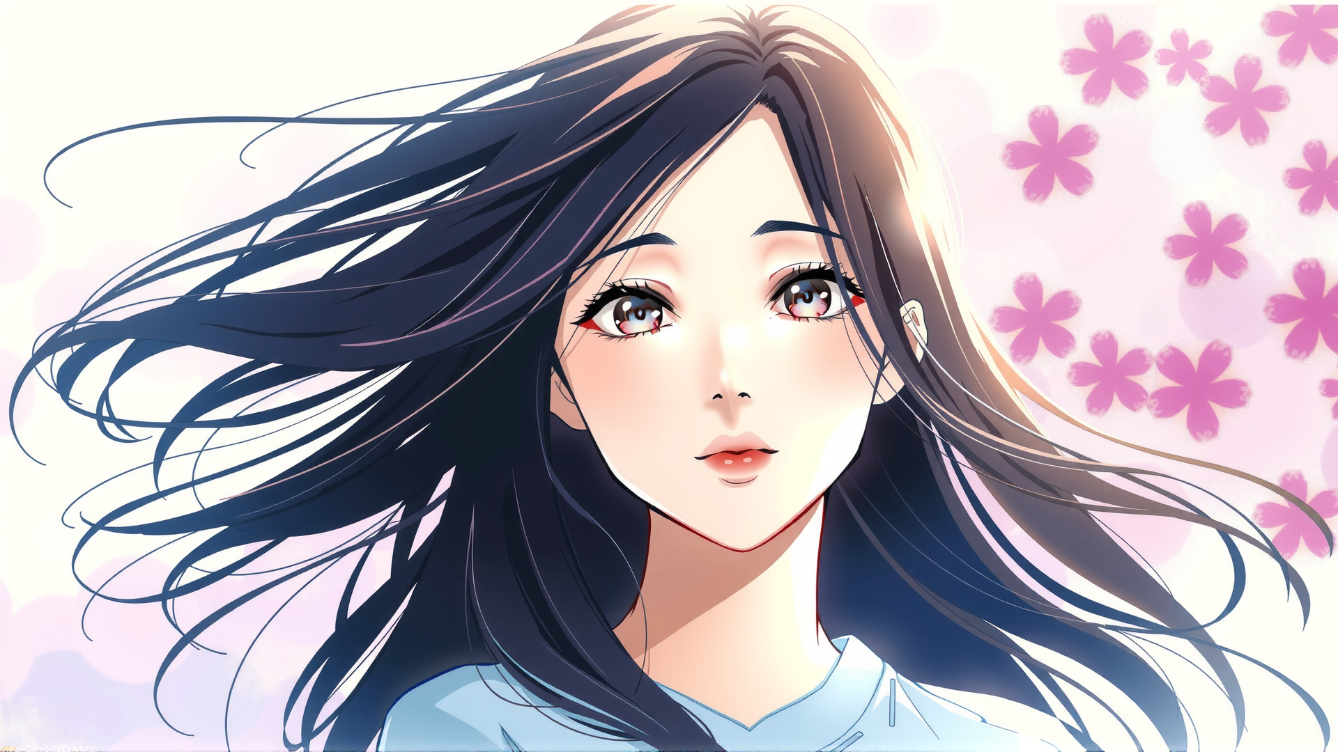 (an anime portrait rendered in soft pastel chalk style, a serene young woman with gentle wind-blown hair), velvety color transitions, delicate shading, subtle texture of chalk dust, soothing palette of gentle blues and pinks, flux style, perfect wallpaper composition