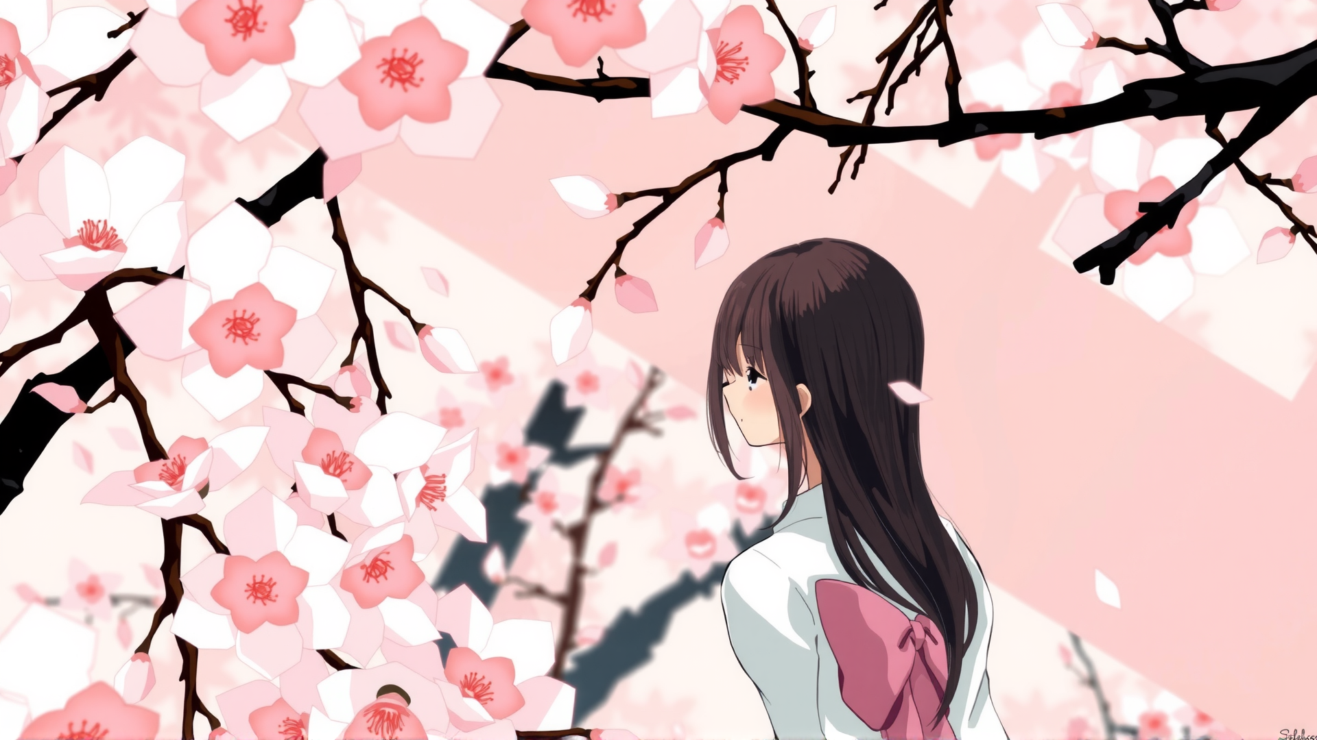 (an anime-style artwork rendered in gentle watercolor tones, featuring a graceful young woman surrounded by blossoming cherry trees), soft pastel hues blending seamlessly, delicate translucent brushwork, airy and serene composition, flux style, perfect wallpaper aesthetic
