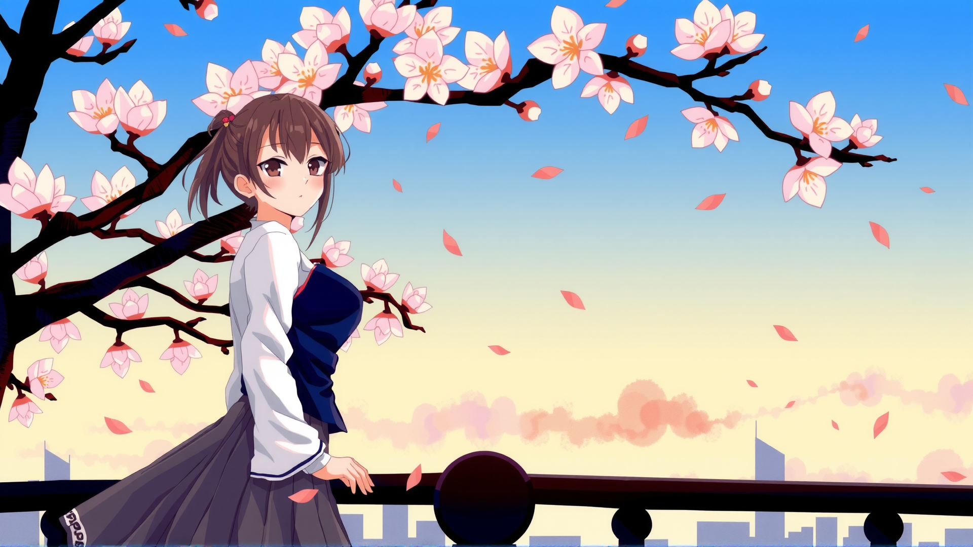 (an anime-style artwork rendered in gentle watercolor tones, featuring a graceful young woman surrounded by blossoming cherry trees), soft pastel hues blending seamlessly, delicate translucent brushwork, airy and serene composition, flux style, perfect wallpaper aesthetic(an anime illustration with refined sketchy line art, depicting a confident young woman leaning against a city railing at dusk), subtle pencil texture, fine ink lines, minimalistic color fills, warm gradients of the evening sky, a sense of movement and urban mood, flux style, ideal wallpaper framing