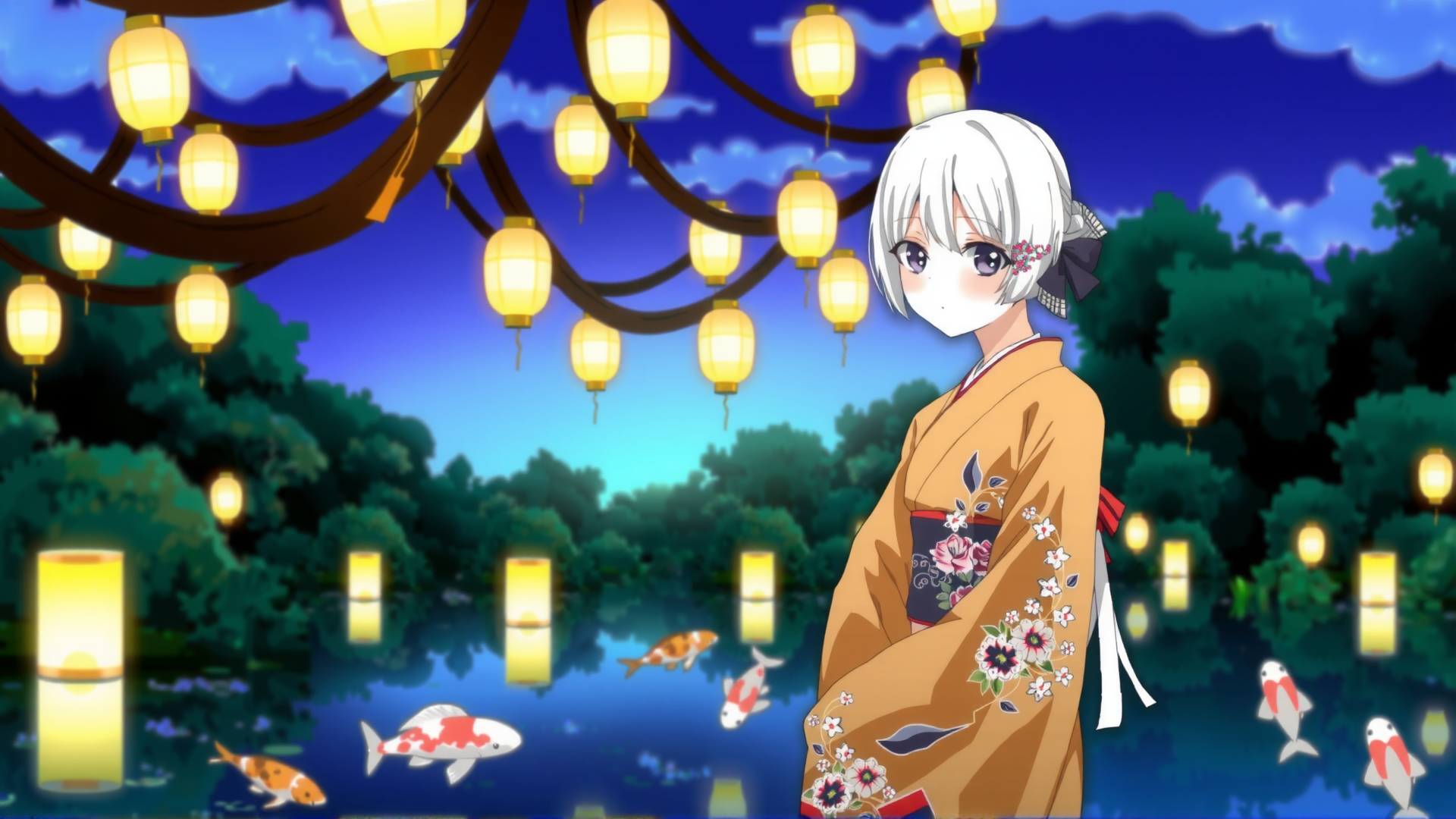 (a beautifully composed anime illustration of a refined young woman wearing a vibrant traditional kimono, standing beneath a canopy of softly glowing paper lanterns), intricate embroidery, subtle gold highlights, gentle night sky hues, a tranquil koi pond reflecting lantern lights, exquisite linework, flux style, wallpaper-quality