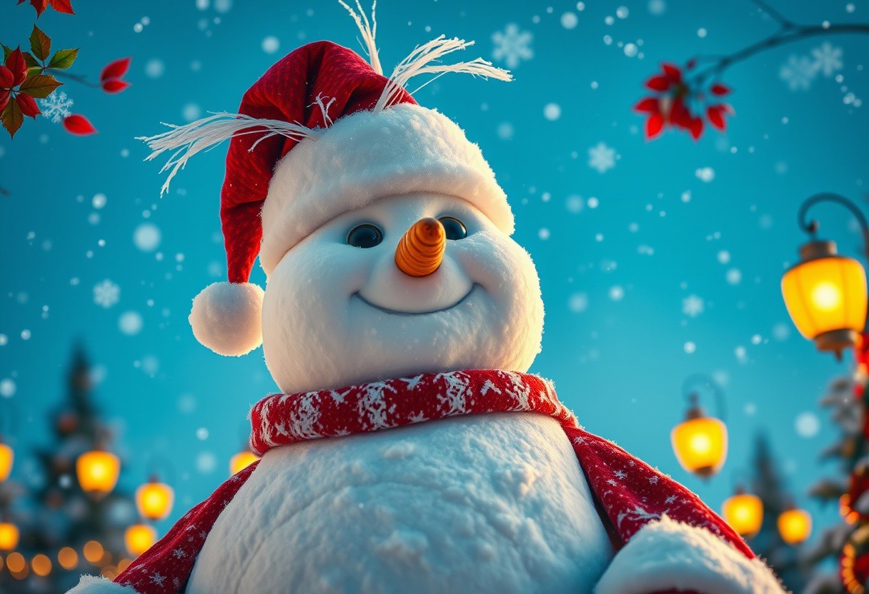 A majestic snowman, donning a Santa Claus suit, stands tall amidst a winter wonderland. The camera captures him in a bold, cinematic framing, with the wind whipping his carrot nose and coal eyes. A brilliant blue sky serves as a canvas for a kaleidoscope of vibrant colors: crimson holly leaves, emerald green snowflakes, and radiant yellow lanterns. As the snowman's hat clings to his head, the RAW image quality shines through in every detail, making this scene a true masterpiece.