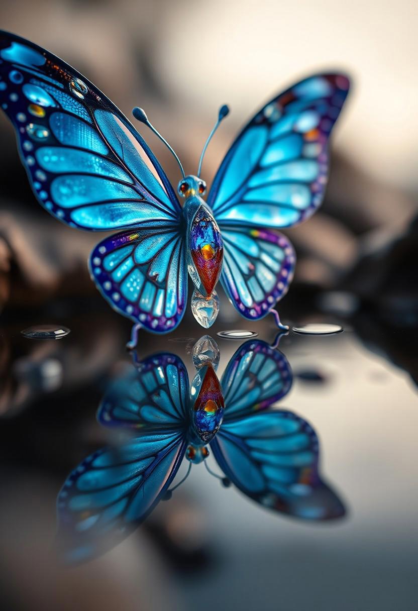 creature like a blue butterfly body made of glowing colorful gems and crystal,Alien Flora, water hydroforming, terraforming. Alien Flora, Miki Asai Macro photography, close-up, Miki Asai’s visual style is ethereal and dreamlike, capturing the beauty of nature in a delicate and poetic way, hyper detailed, trending on artstation, fantastic Realism and Sharp Focus, studio photo, intricate details, highly detailed, by greg rutkowski detailed face, detailed skin, reflection