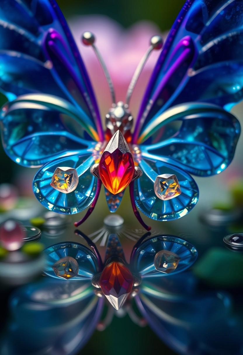 creature like a blue butterfly body made of glowing colorful gems and crystal,Alien Flora, water hydroforming, terraforming. Alien Flora, Miki Asai Macro photography, close-up, Miki Asai’s visual style is ethereal and dreamlike, capturing the beauty of nature in a delicate and poetic way, hyper detailed, trending on artstation, fantastic Realism and Sharp Focus, studio photo, intricate details, highly detailed, by greg rutkowski detailed face, detailed skin, reflection