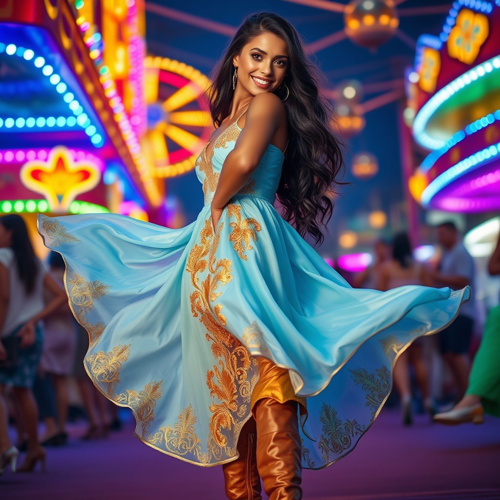 Imagine an exhilarating scene set in a bustling carnival at night, where neon lights cast a vibrant glow across the lively atmosphere. Amidst the sea of colors, Laneya Grace stands at the center of the action. She wears a flowing, light-blue dress adorned with golden embroidery that glistens under the carnival lights. Her dress sways gracefully with her every movement, embodying both elegance and dynamism. She pairs the dress with gold-accented high-heeled boots that add to her commanding presence. Her long, raven-black hair cascades down her back in loose waves, catching the light and creating a stunning contrast against her attire. Her eyes, wide with excitement, sparkle like the stars, reflecting the myriad of colors around her. A mischievous smile plays on her lips, suggesting a sense of adventure and joy as she takes in the vibrant surroundings.