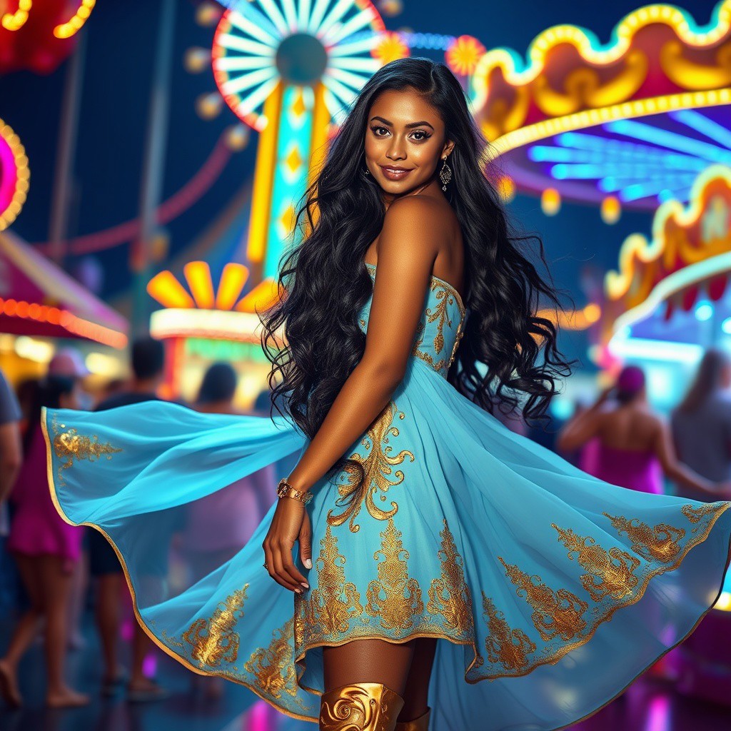 Imagine an exhilarating scene set in a bustling carnival at night, where neon lights cast a vibrant glow across the lively atmosphere. Amidst the sea of colors, Laneya Grace stands at the center of the action. She wears a flowing, light-blue dress adorned with golden embroidery that glistens under the carnival lights. Her dress sways gracefully with her every movement, embodying both elegance and dynamism. She pairs the dress with gold-accented high-heeled boots that add to her commanding presence. Her long, raven-black hair cascades down her back in loose waves, catching the light and creating a stunning contrast against her attire. Her eyes, wide with excitement, sparkle like the stars, reflecting the myriad of colors around her. A mischievous smile plays on her lips, suggesting a sense of adventure and joy as she takes in the vibrant surroundings.